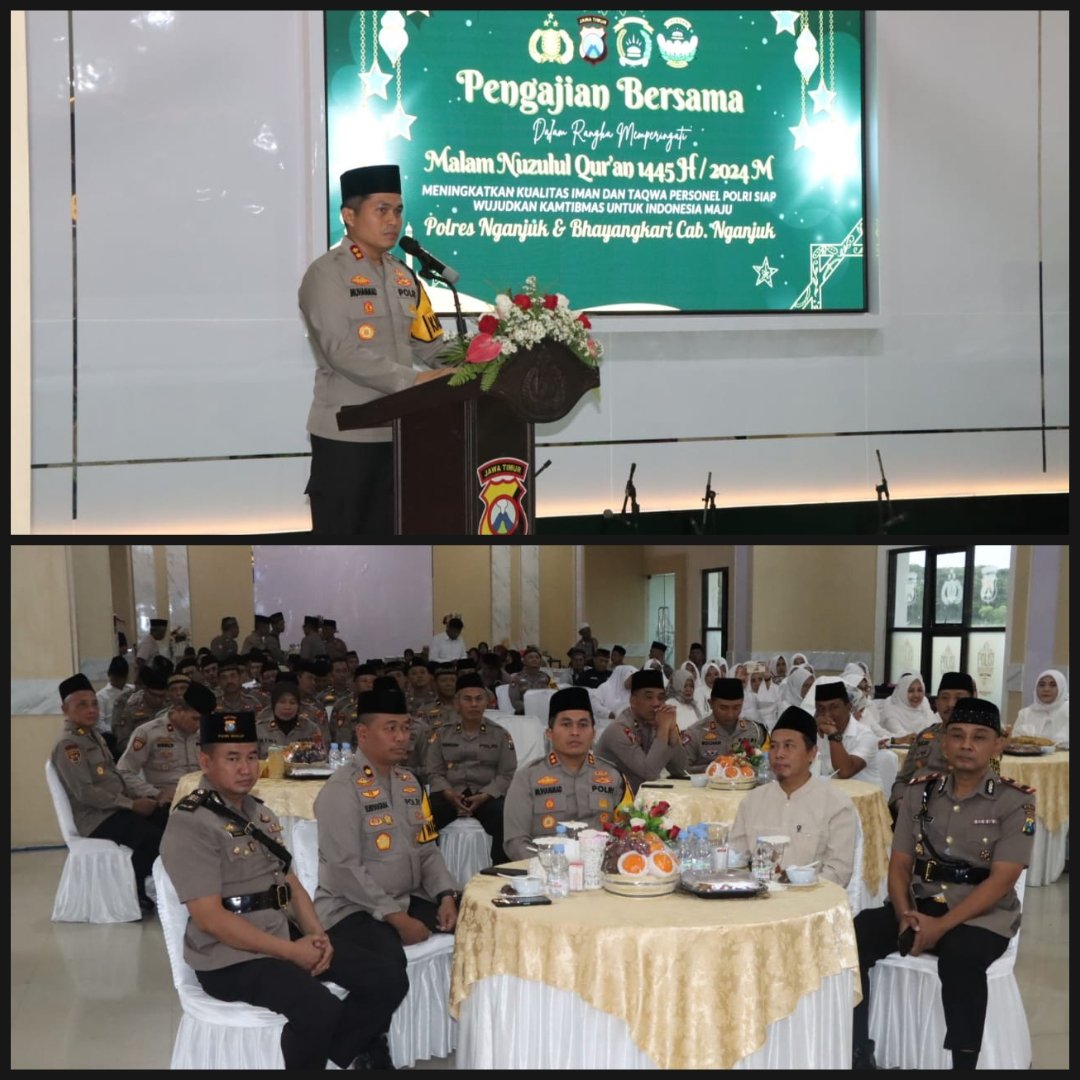 Nganjuk,beritanewsnasional.com -Kapolres Nganjuk AKBP Muhammad, S.H., S.I.K., M.Si., bersama Wakapolres Nganjuk, Pejabat Utama (PJU), Ketua Bhayangkari Cabang Nganjuk Ny. Anggun Muhammad beserta pengurus dan anggota Polres Nganjuk beserta Bhayangkari menggelar pengajian bersama dalam rangka Peringati Malam Nuzulul Qur’an 1445H/2023M, Kamis (28/03/2024).