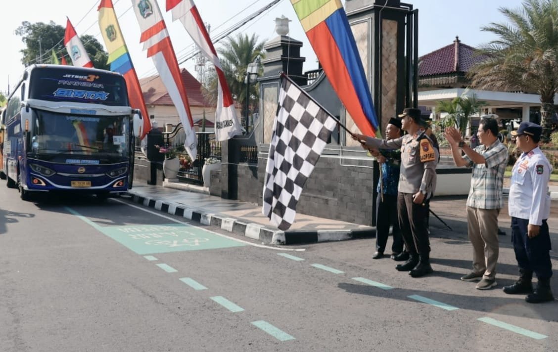 Kapolres Magetan, AKBP Satria Permana, S.H., S.I.K bersama Forkopimda Kabupaten Magetan melepas pemberangkatan 350 pemudik asal Magetan yang mengikuti program Balik Bareng Gratis Lebaran 1445 H/2024 M dengan tujuan Surabaya, Senin (15/4/2024) pagi.