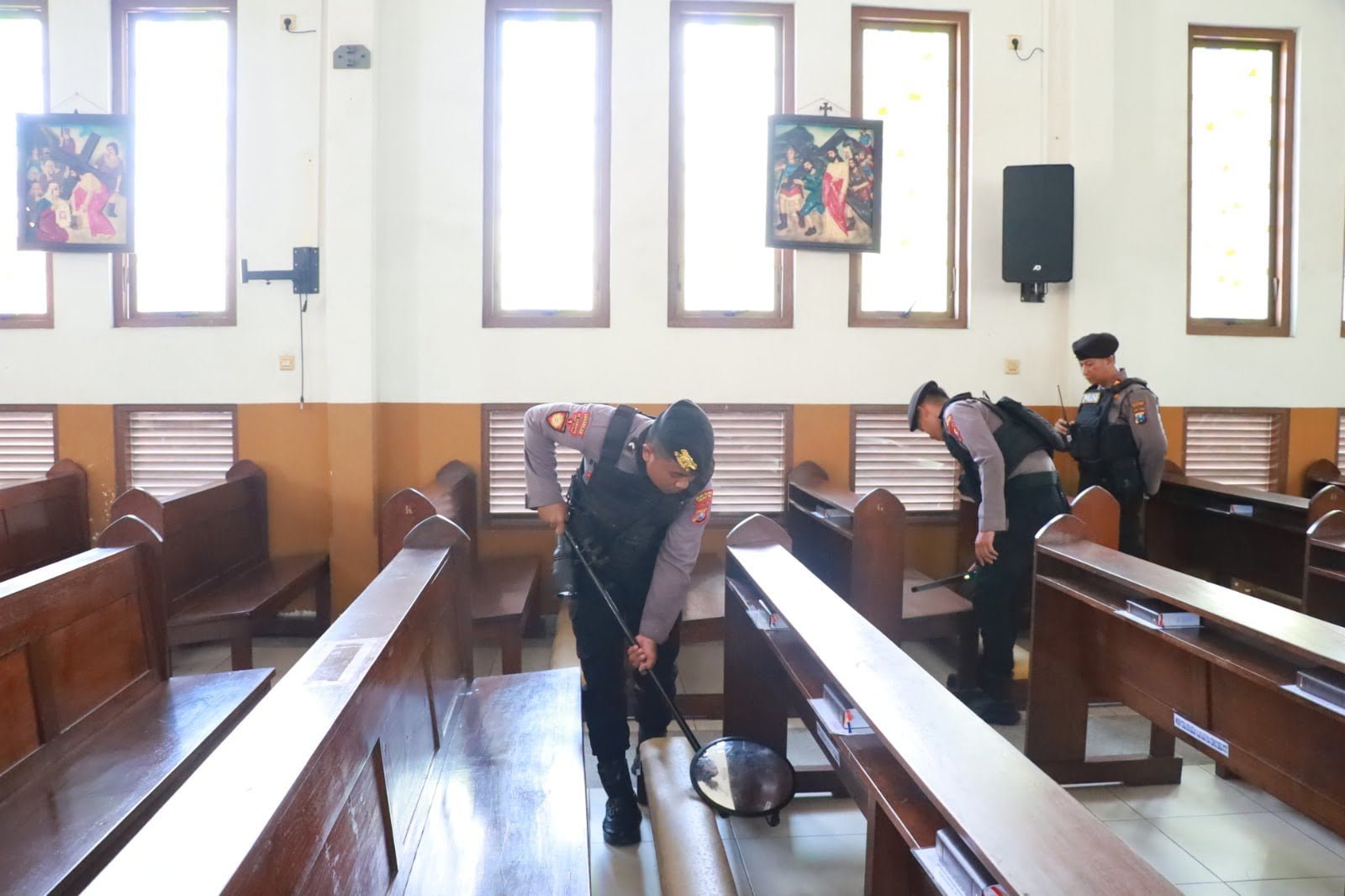 Polisi juga melakukan penyisiran menggunakan anjing pelacak serta alat metal detector dan alat mirror untuk memeriksa di sudut-sudut Gereja maupun kolong-kolong kursi duduk jema'at.