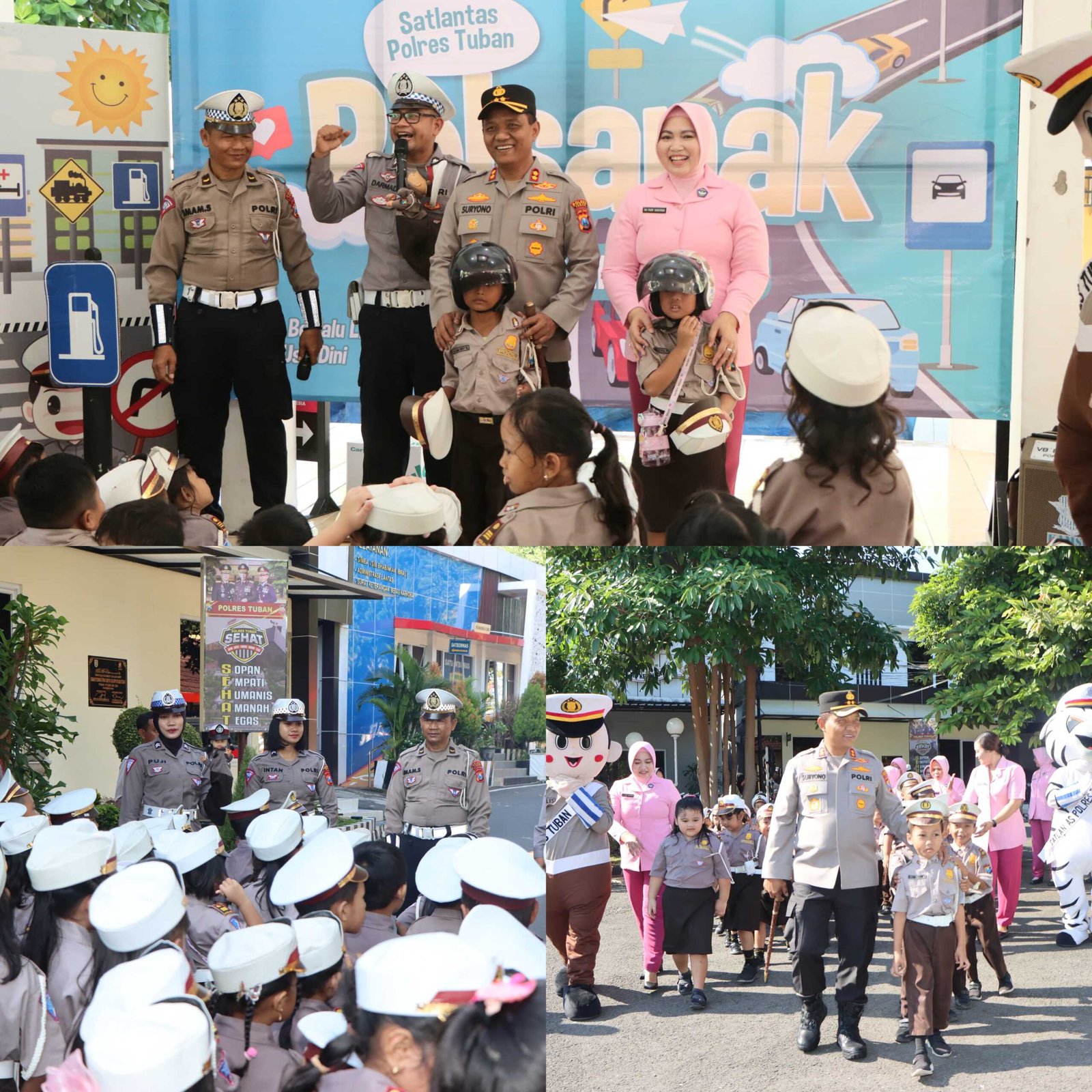 Ratusan murid dari Taman Kanak-kanak (TK) Bhayangkari 68 Tuban terlihat sangat antusias mengikuti rangkaian kegiatan yang di pandu oleh beberapa personel Satlantas Polres Tuban yang dihadiri oleh Kapolres Tuban AKBP Suryono, S.H., S.I.K., M.H., didampingi ketua Bhayangkari Cabang Tuban Ny. Pury Suryono, Jumat (17/05/2024)