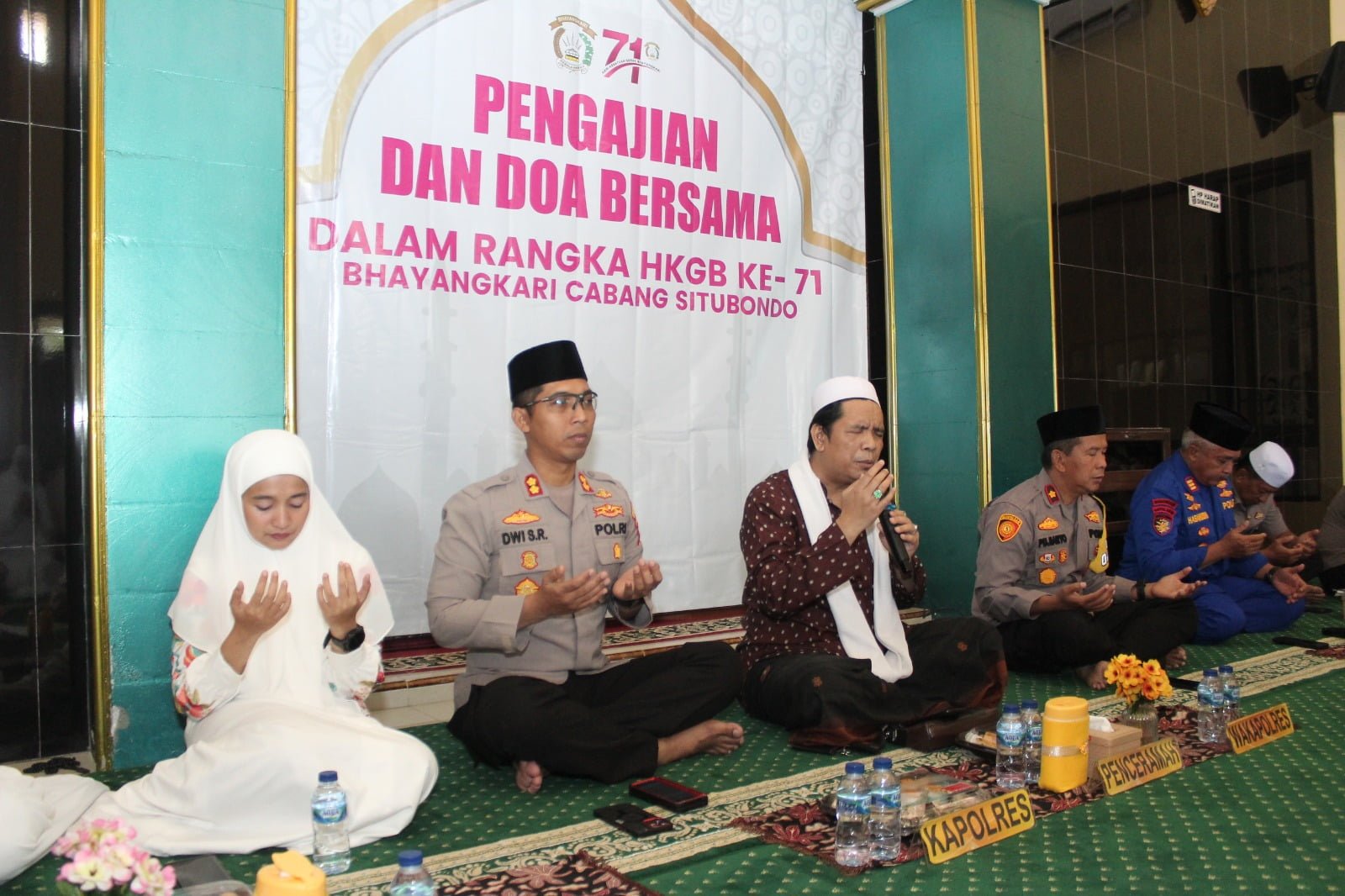 Situbondo, (Berita News Nasional) Menyambut Hari Kesatuan Gerak Bhayangkari (HKGB) ke- 71 tahun 2023, Pengurus Bhayangkari Cabang Situbondo mengadakan Doa bersama dan Santunan Anak Yatim di Masjid Al-Asykar Polres Situbondo, Kamis (7/9/2023) pekan lalu.