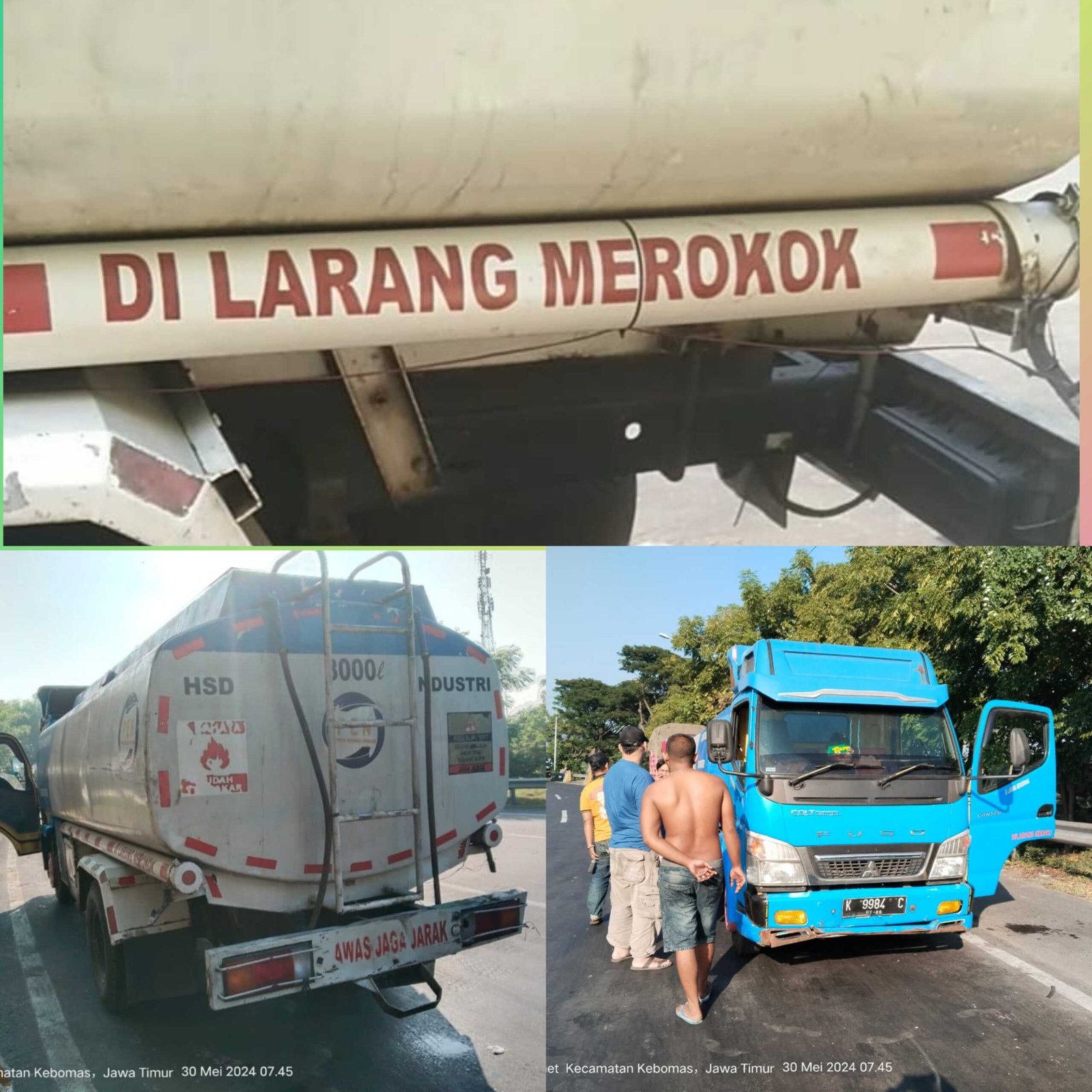 Tim awak media yang sedang melintas menuju pintu masuk gerbang tol kebomas-surabaya mencium aroma bbm jenis solar yang bercecer di sepanjang jalan pintu masuk menuju gerbang tol kebomas, alhasil tim mendapati ceceran bbm jenis solar tersebut berasal dari sebuah truck tangki bbm industri berlogo PT.Putra Energi Niaga (PEN) dengan nopol K 9984 C yang sedang berhenti sebelum pintu masuk gerbang tol.