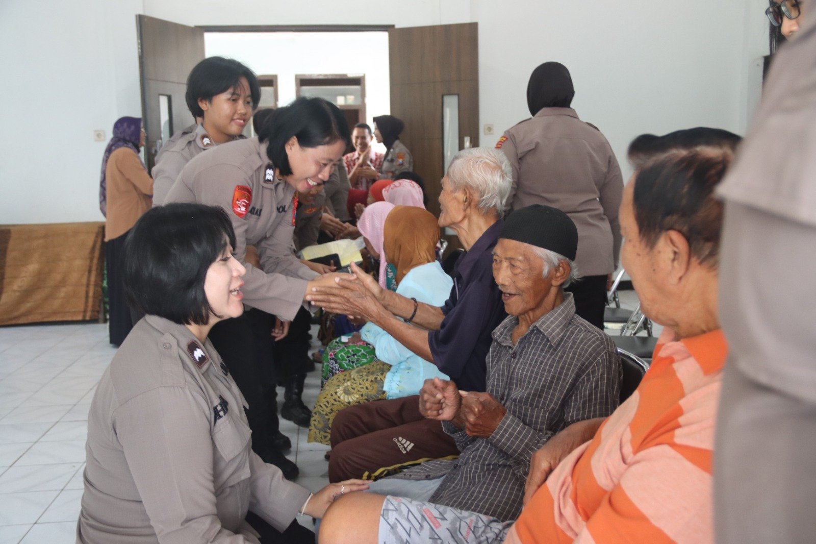 Para Polwan Polres Mojokerto ini juga sempat bercengkrama dengan para lansia, mendengarkan cerita mereka, dan membantu mereka dengan penuh kasih sayang.