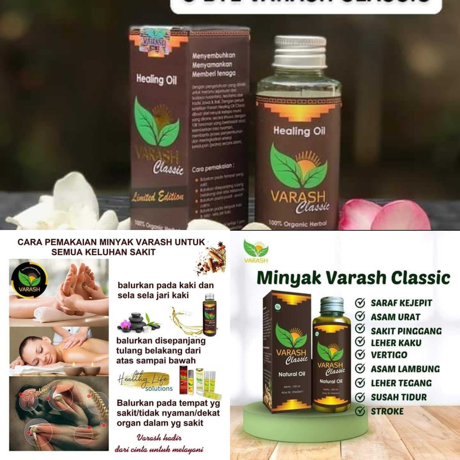 Minyak Varash sudah terbukti dapat membantu menyembuhkan lebih dari 78 jenis penyakit tanpa ada efek samping. Cara pemakaian minyak Varash ini tidak diminum tetapi cukup dengan membalurkan Minyak Varash di organ – organ tubuh tertentu sesuai dengan sakit yang di derita.