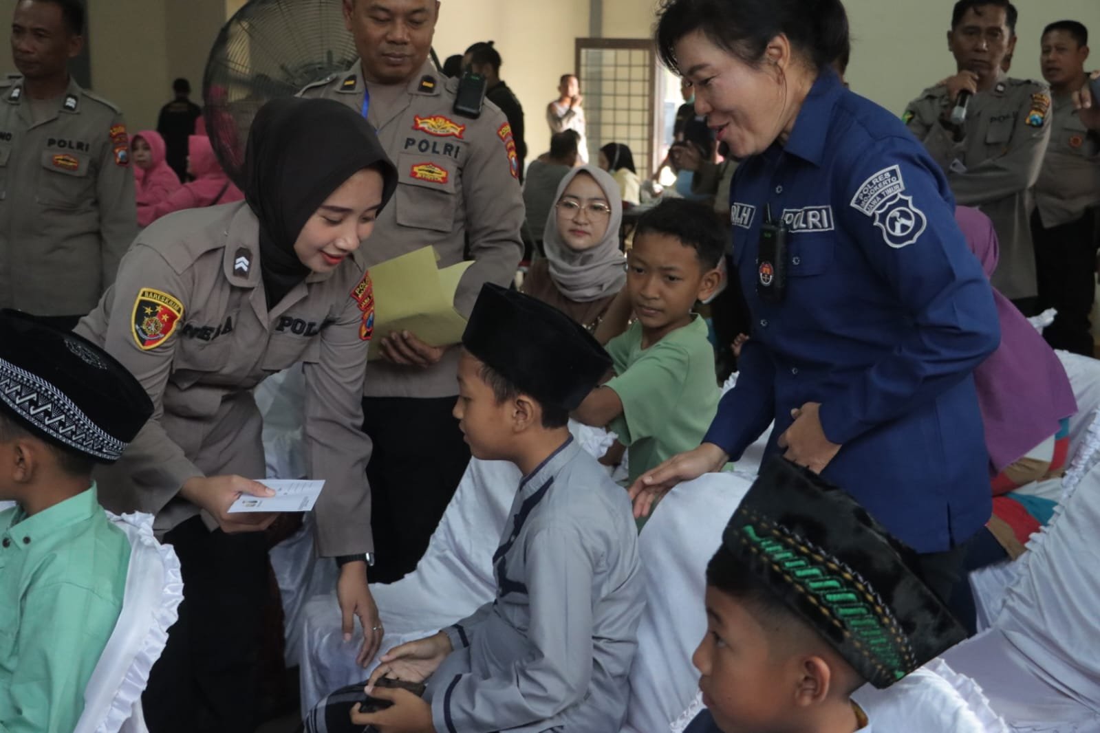 Senyumannya yang ramah, Polwan Polres Mojokerto ini mampu menenangkan anak – anak yang mengikuti khitan masal.