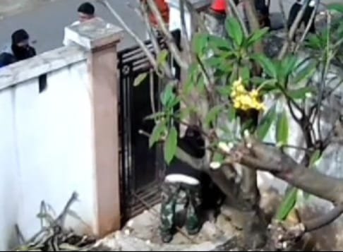 Sejurus kemudian si pemegang tongkat terlihat menyuruh salah satu seseorang yang bercelana doreng tersebut meloncat pagar dan membobol kunci berkali kali dihantam dengan palu, setelah kunci pagar berhasil terlepas lalu mereka masuk bersama seorang ibu berpakaian jilbab nampak dikawal beberapa orang.