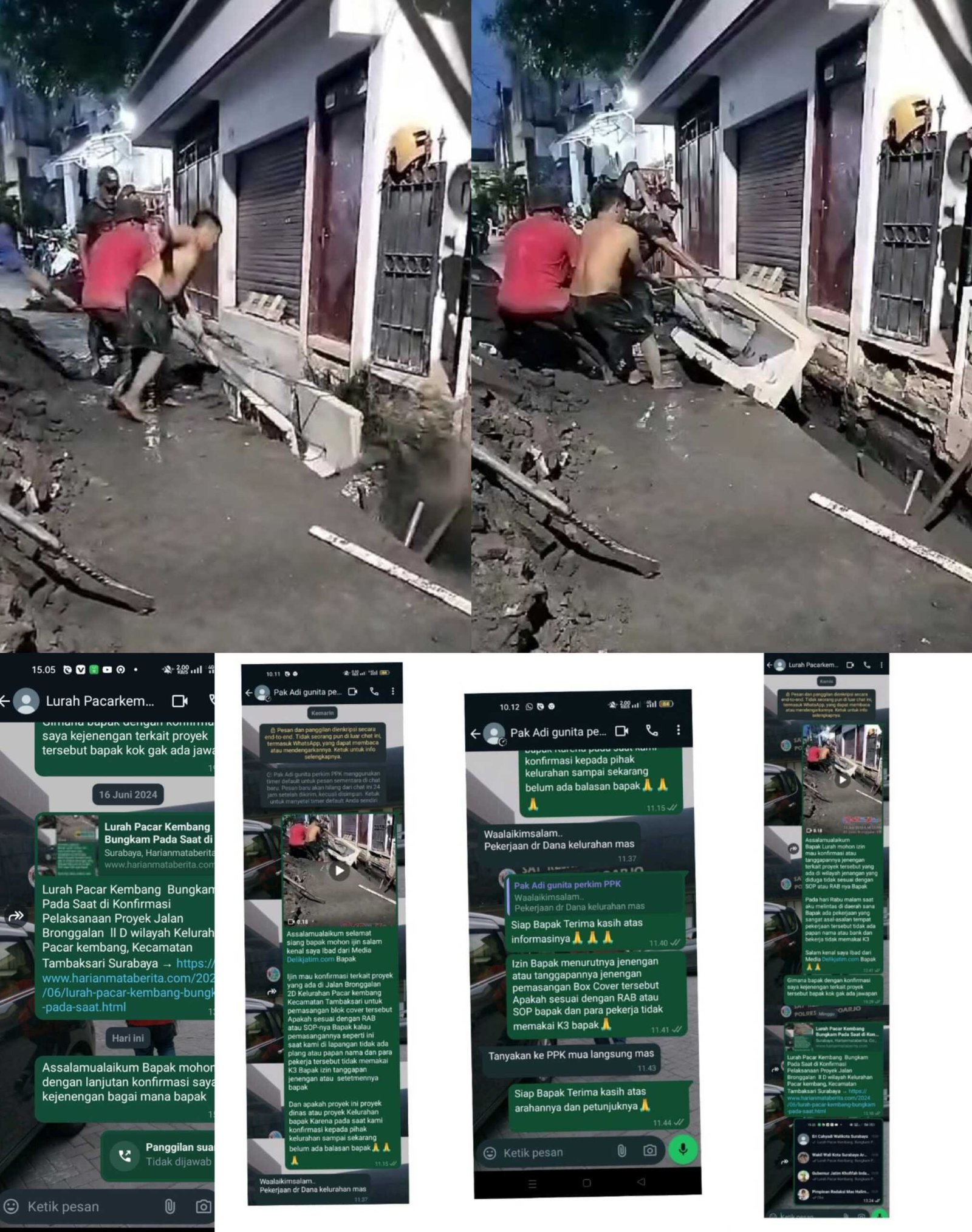 Menindaklanjuti temuan tersebut, Kemudian Awak Media mencoba mengkonfirmasi melalui chat WhatsApp. Kepada Bapak Adi Gunita Kepala Bidang Jalan dan Jembatan Kota Surabaya, Pada hari selasa tanggal 18/6/2024 Sekitar Jam 11:15 WIB dengan adanya pekerjaan proyek gorong-gorong saluran U-Ditch di Jalan Bronggalan IID yang sangat amburadul Apakah pekerjaan tersebut proyek Dinas atau Kelurahan