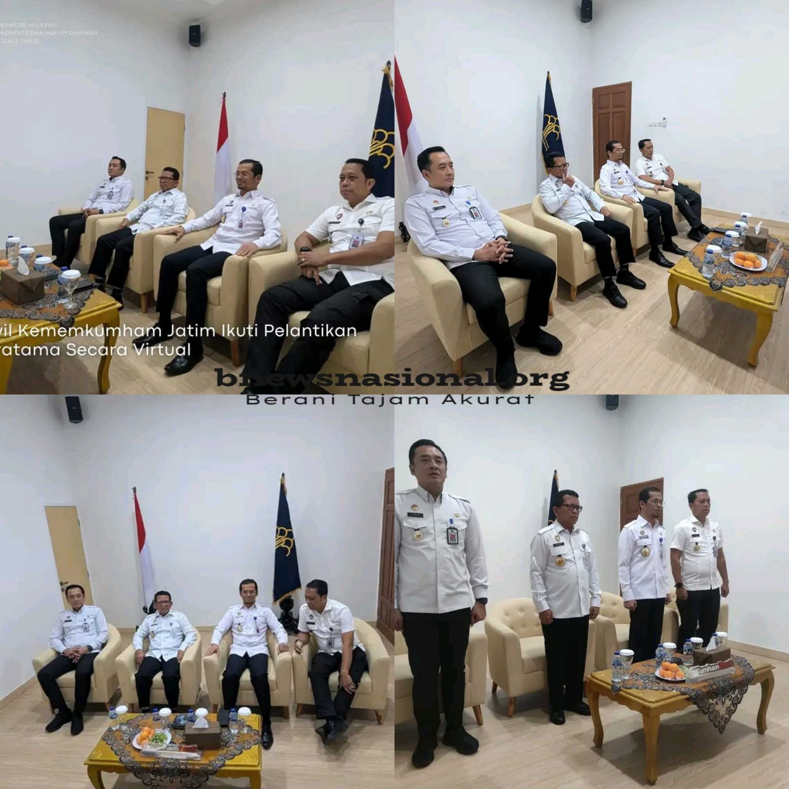 Surabaya l bnewsnasional org - Jajaran Pimpinan Tinggi Pratama Kanwil Kemenkumham Jatim mengikuti Upacara Pelantikan dan Pengambilan Sumpah Jabatan Pimpinan Tinggi Pratama pada jajaran Keimigrasian secara virtual pada Rabu (10/7).
