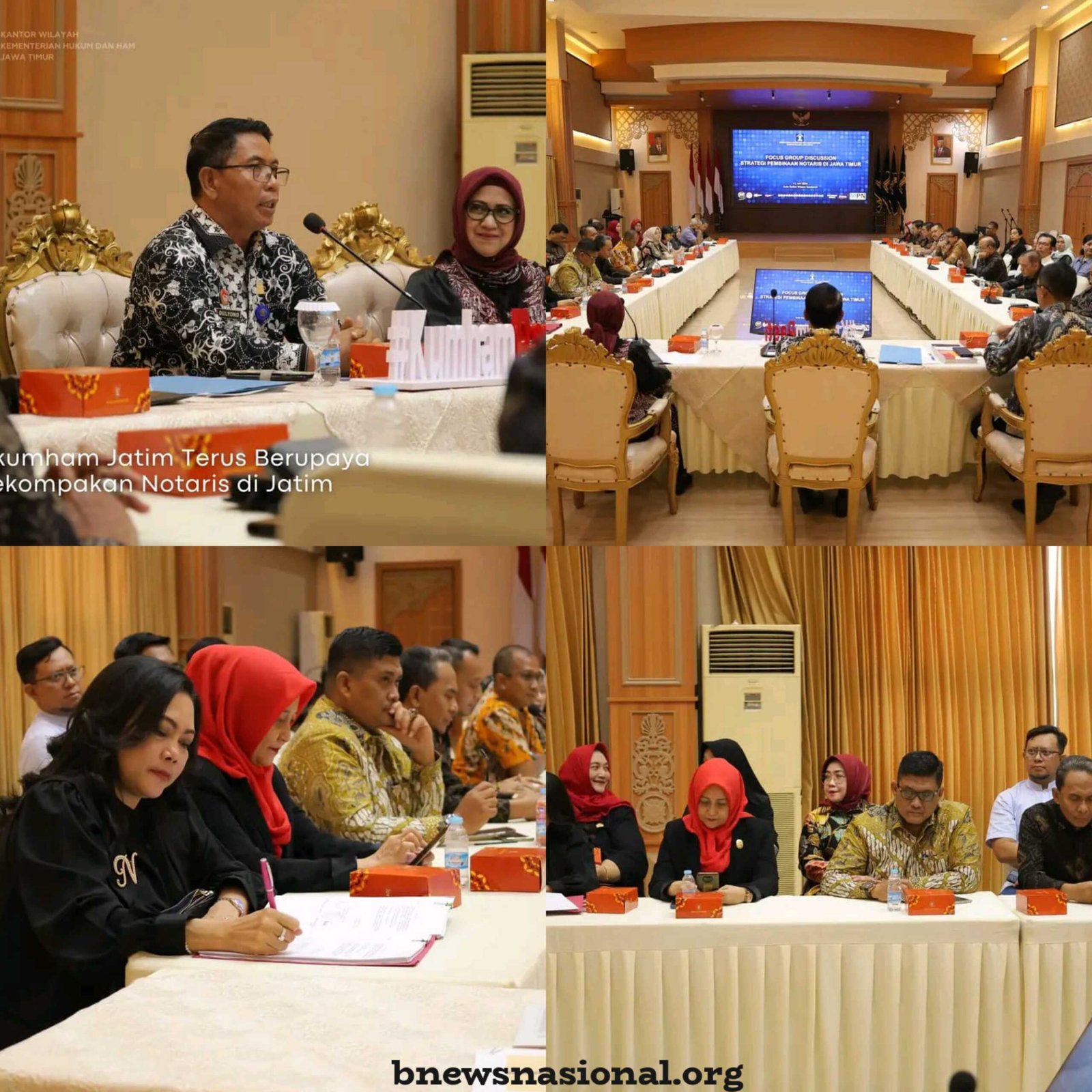 Surabaya l bnewsnasional.id - Sebagai instansi pembina notaris di wilayah, Kanwil Kemenkumham Jatim terus berupaya menjaga kekompakan para pejabat publik itu. Salah satunya dengan menyelenggarakan Focus Group Discussion (FGD) yang melibatkan seluruh stakholder di bidang kenotariatan, Kamis (11/7).