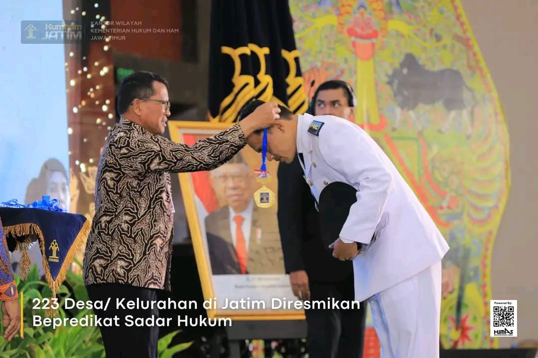 Batu l bnewsnasional.id - Kanwil Kemenkumham Jatim meresmikan 223 Desa/ Kelurahan mendapatkan predikat Anubhawa Sasana Desa atau telah sadar hukum, Selasa (30/7). Diharapkan dengan menumbuhkan kesadaran hukum di level desa/ kelurahan diharapkan dapat mendukung peningkatan investasi dan pertumbuhan ekonomi.