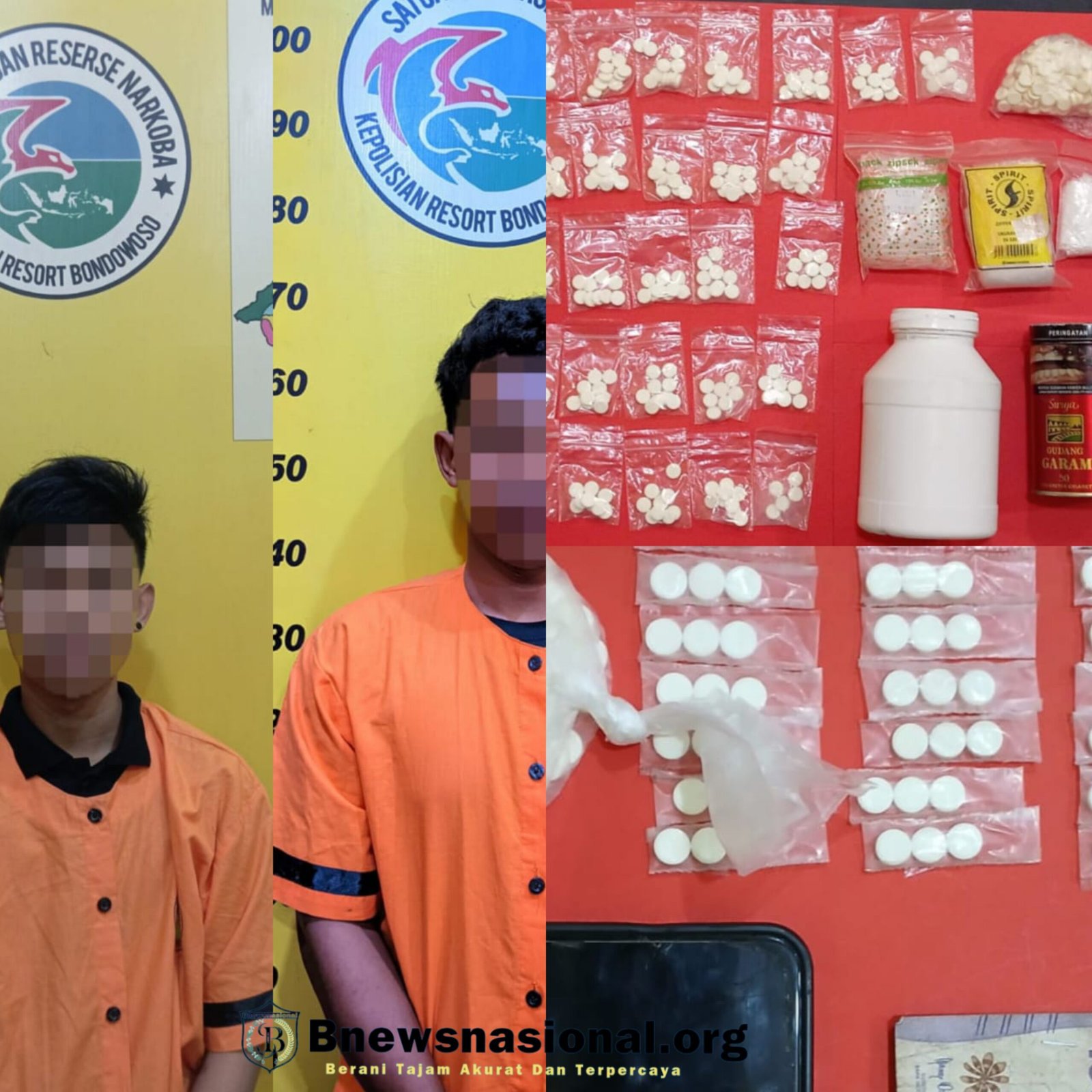 "Kedua pelaku beserta barang bukti berupa Pil logo Y tersebut berhasil diamankan oleh Satreskoba Polres Bondowoso di tempat yang berbeda. Diketahui bahwa pelaku MA berhasil diamankan di rumah temanya Desa Tarum Kecamatan Prajekan. Sedangkan Tersangka DB juga sama diamankan saat tersangka berada dirumahnya yang beralamat di Desa Jurangsapi Kecamatan Tapen, "terang Kapolres Bondowoso.