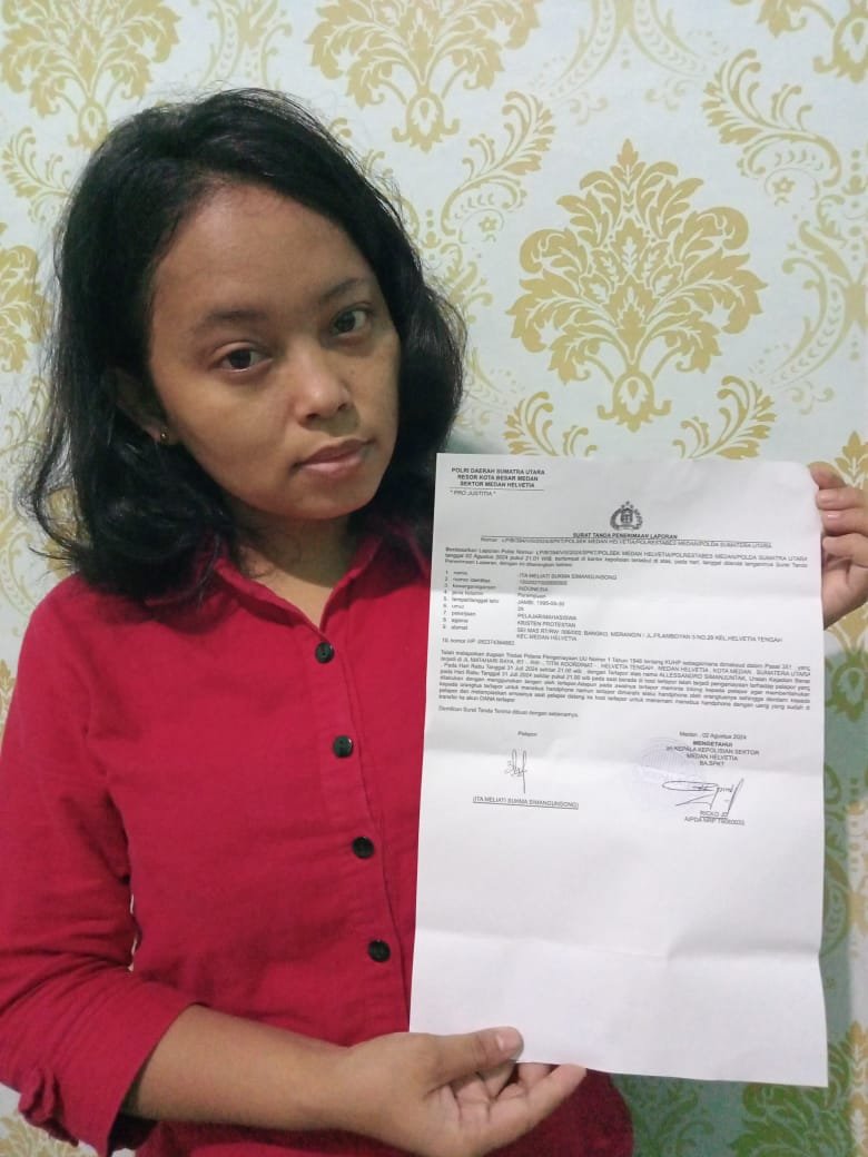 Ita Meliati Sukma Simangunsong yang menjadi korban tak bisa berbuat apapun terhadap AS. Ia hanya bisa pasrah tanpa melakukan perlawanan apapun, hingga korban mendatangi Polsek Helvetia untuk mencari keadilan dengan membuat laporan resmi dengan nomor Tanda Lapor Polisi Nomor : LP/B/394/VIII/2024/SPKT/POLSEK HELVETIA /POLRESTABES MEDAN/POLDA SUMATERA UTARA.