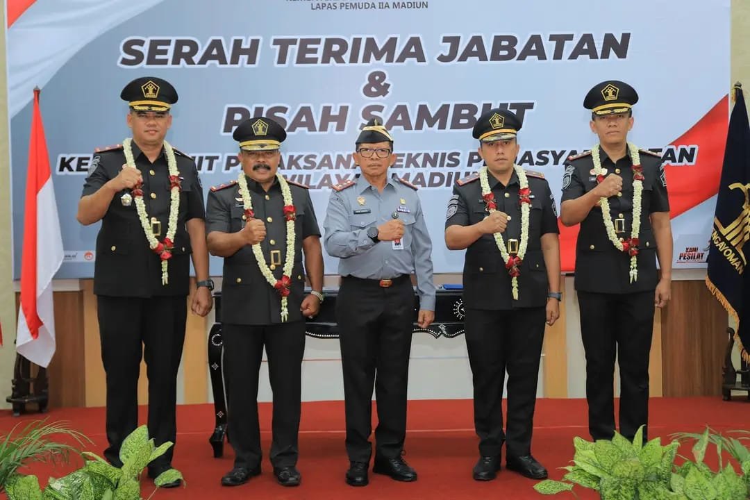 Kakanwil Kemenkumham Jawa Timur, Heni Yuwono, menyampaikan apresiasi tinggi terhadap prestasi yang dicapai oleh Kalapas Pemuda Madiun yang lama, Ardian Nova Christiawan dan Kepala Bapas Madiun, Wahyu Budi Heriyanto, dalam acara Serah Terima Jabatan (Sertijab) di Aula Adi Sujatno Lapas Pemuda Madiun hari ini.