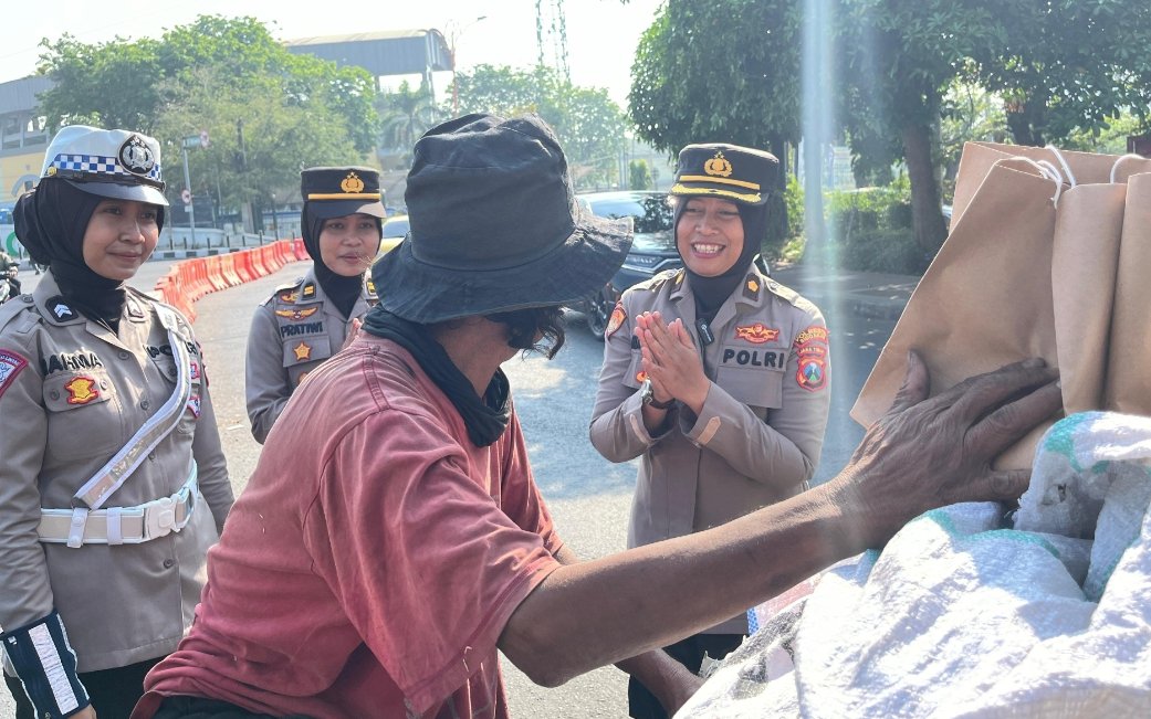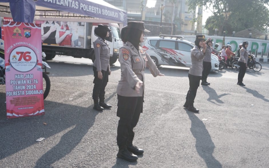 Dengan humanis Polwan dari Polresta Sidoarjo membantu kelancaran lalu lintas serta menyapa masyarakat, yakni dengan membagikan bingkisan berlabelkan stiker Hari Jadi Polwan ke-76.