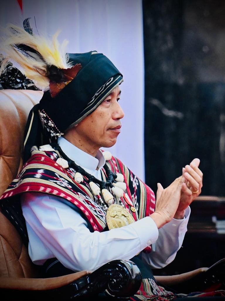 Presiden Jokowi tampak memakai kemeja putih yang dibalut kain tenun menyilang berwarna dominan merah marun dan hitam.