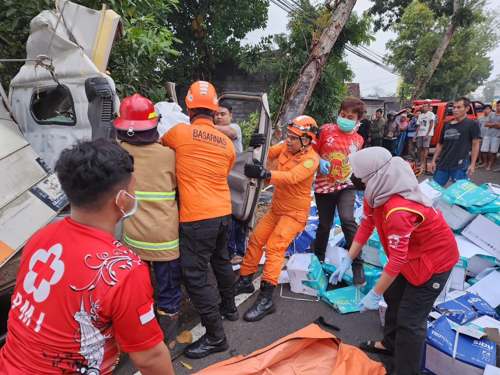 Tim Rescue Pos Basarnas Gunungkidul yang diberangkatkan sesampai dilokasi langsung berkordinasi dengan Satlantas Polres Gunungkidul untuk proses evakuasi yang terjepit body kendaraan.Setelah kurang lebih 1 jam Proses evakuasi oleh Tim SAR Gabungan 2 korban berhasil di evakuasi.Korban atas nama Warsiwan (lakis/42 tahun) warga Ds. ketenger Rt. 1/1 Kec Baturaden, Banyumas, Jateng fi evakuasi dengan kondisi Meninggal Dunia dan korban atas nama Nur Arifin (Lakis/ 40 Tahun) warga Beji Rt. 003/001, Beji, Kedungbanteng di evakuasi dalam keadaan Selamat.Kedua Korban selanjutnya diserahkan ke pihak Kepolisian dan pihak PMI Gunungkidul untuk di bawa ke RSUD wonosari.