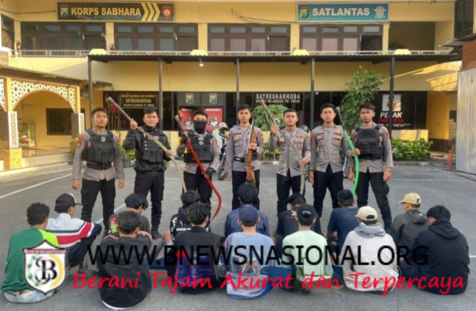 Patroli yang digelar sejak pukul 03.00 WIB di Tambak Wedi Baru membuahkan hasil. Sebanyak 14 pemuda yang diduga terlibat dalam aksi kekerasan tersebut berhasil diamankan. Selain itu, petugas juga menyita sejumlah barang bukti berbahaya, seperti 4 senjata tajam, sebuah senapan angin, 3 unit sepeda motor, serta 11 unit ponsel milik para pelaku.