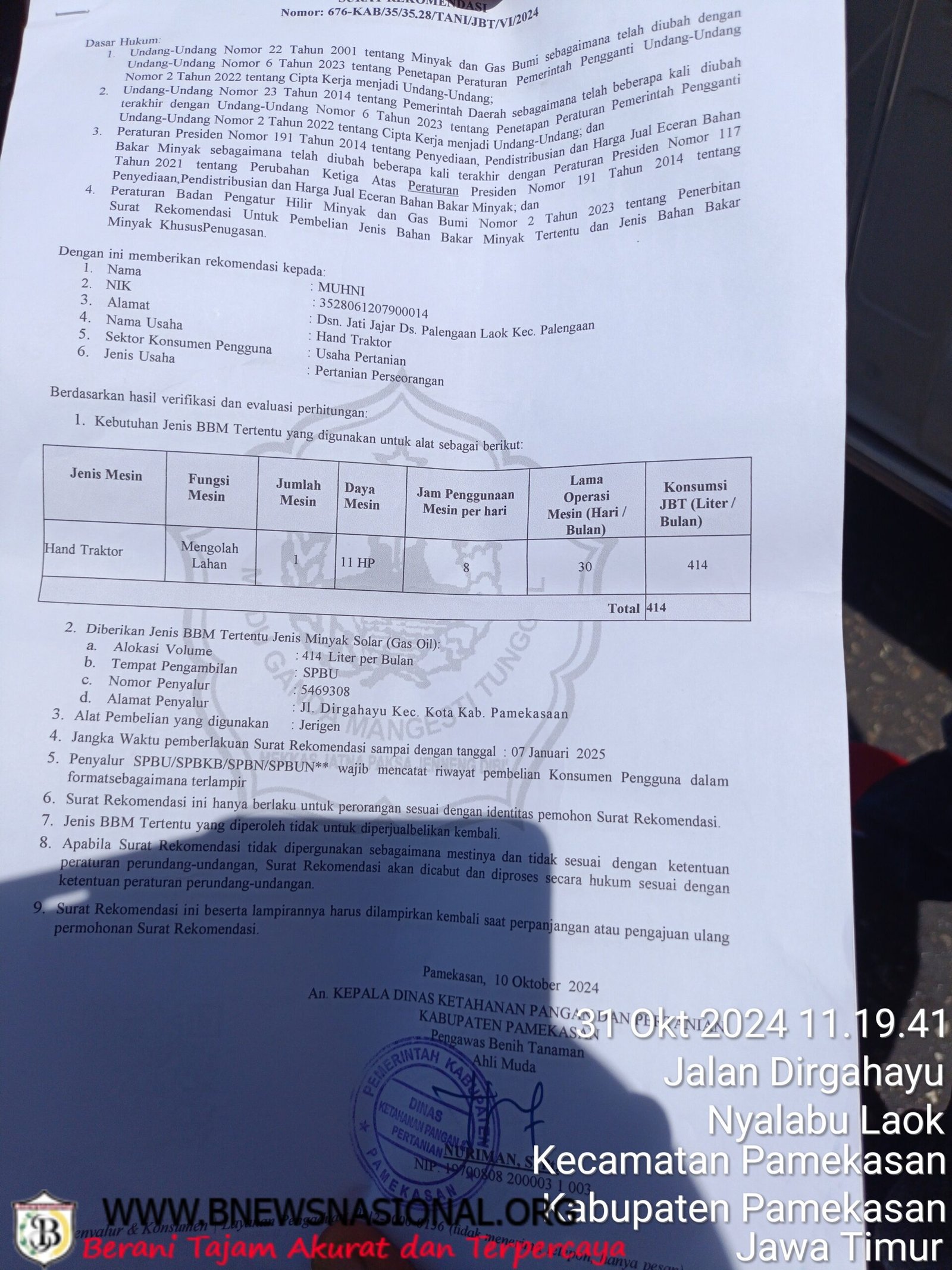 Anehnya, ketika ditanya mengenai legalitas tindakannya, salah seorang pengecer berinisial ( M ) yang membawa mobil Grand max warna putih nopol M 8853 CY dan menunjukkan sebuah dokumen yang diklaim sebagai izin dari Dinas Pertanian dengan biaya Rp.250.000 (Dua ratus lima puluh ribu) Namun, keaslian dan keabsahan dokumen tersebut masih perlu dikonfirmasi lebih lanjut.