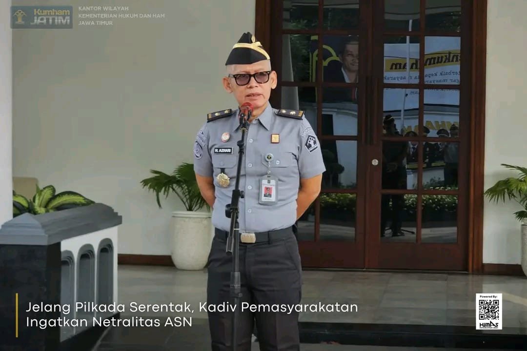 Surabaya l Bnewsnasional.org - Kepala Divisi Pemasyarakatan Kanwil Kemenkumham Jatim, Heri Azhari, mengingatkan kewajiban ASN untuk berpartisipasi aktif dalam penyelenggaraan pemilihan kepala daerah pada Rabu (27/11) mendatang. Salah satunya dengan menggunakan hak suara langsung ke Tempat Pemungutan Suara (TPS) dan menjaga netralitas.