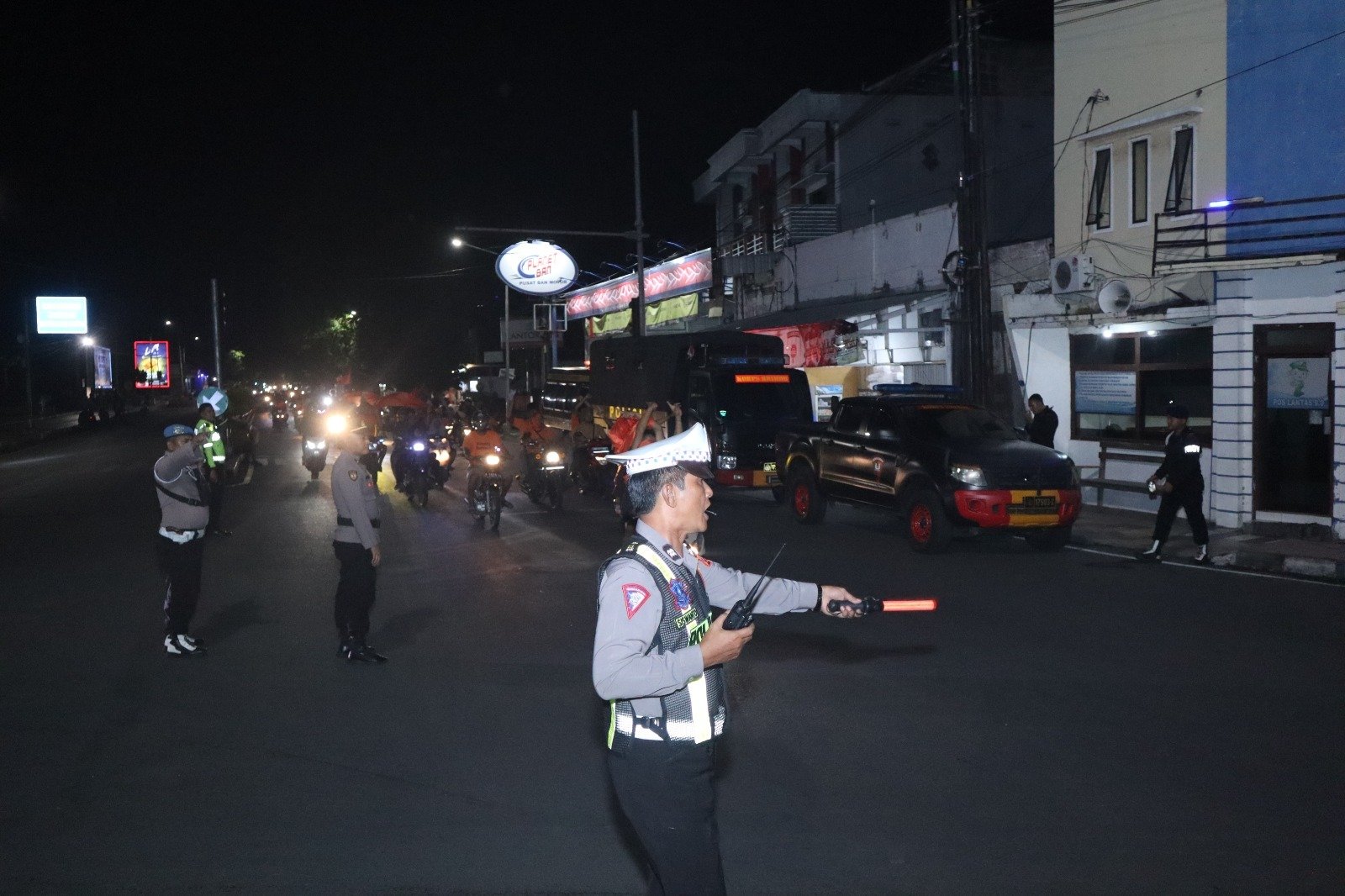 “Malam ini kami siaga di beberapa ruas jalan raya dalam rangka mencegah simpastisan atau pendukung paslon yang melakukan konvoi merayakan kemenangan paslon yang didukungnya," ujar AKBP Rezi.