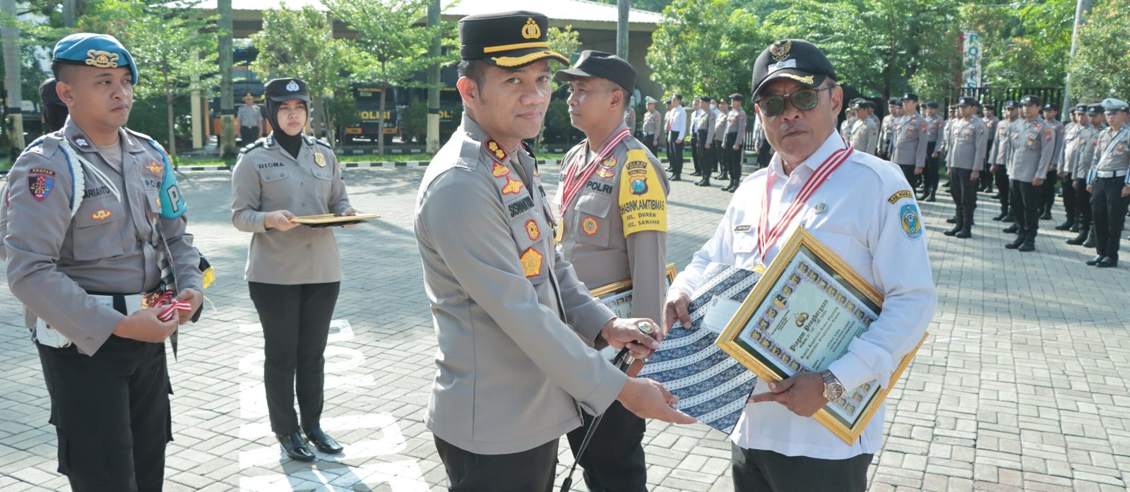 Beliau juga memberikan ucapan selamat kepada AKP Riduwan, S.H., Kapolsek Prambon, yang dinaikkan pangkatnya menjadi Komisaris Polisi (Kompol).
