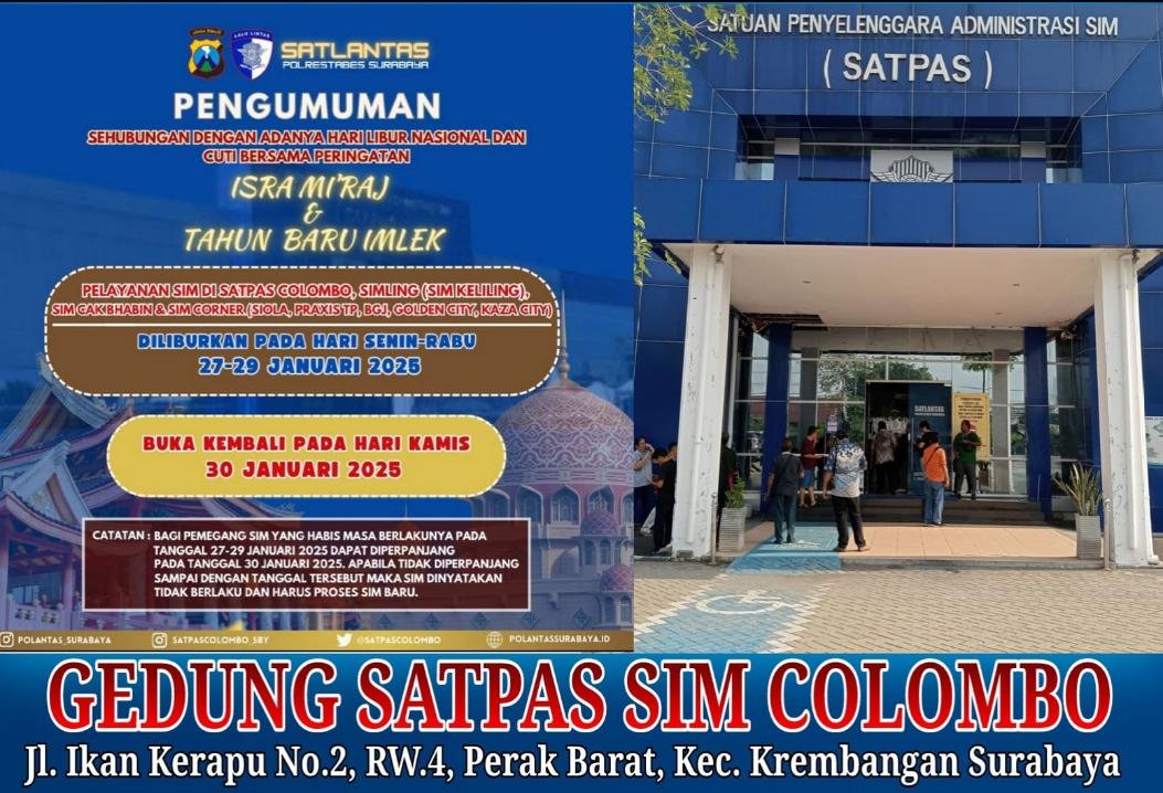 Awak Media menemui IPTU Dyah Ayu Mirda Puspita Redhaningtyas, S.Tr.K., M.H., selaku Kanit Regident Satpas SIM Colombo mengatakan melalui IPTU Erwandi selaku Kabsunit 1 dan di dampingi Kabsubnit 2 yakni Ipda Hariyo serta Ipda Dani mengatakan Sabtu (25/01/2025), Dalam hal pelayanan publik, khususnya di pelayanan Satpas Colombo Surabaya yang berkaitan dengan hari libur cuti bersama atau libur Nasional, seluruh pelayanan Satpas SIM di Indonesia khususnya Satpas SIM Colombo Surabaya tutup untuk semetara waktu," katanya.