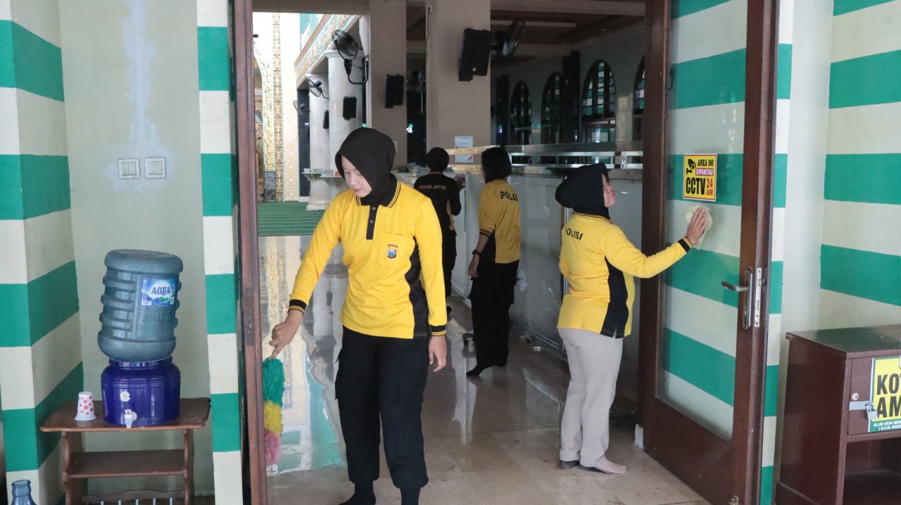 Sejumlah personel kepolisian dikerahkan untuk membersihkan bagian dalam dan luar masjid, termasuk menyapu, mengepel, mencuci karpet, serta merapikan fasilitas ibadah.