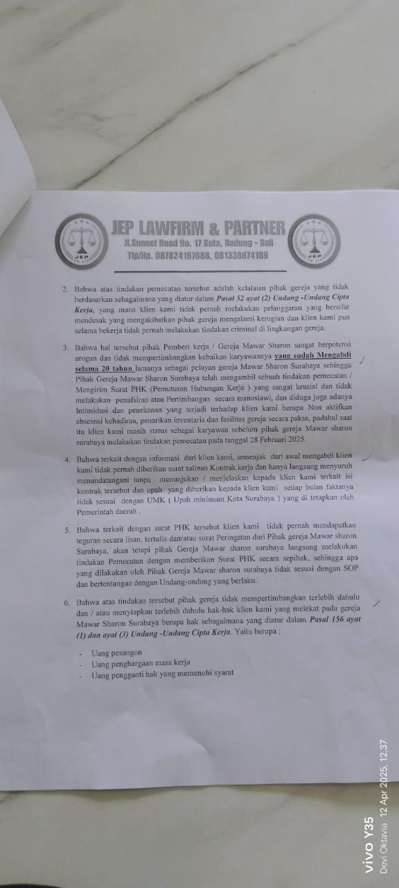 Berdasarkan surat kuasa yang diterima, para Advokat dan Konsultan Hukum dari JEP Lawfirm & Partner menyatakan keprihatinan mendalam atas tindakan Gereja Mawar Saron Surabaya yang diduga melakukan pemecatan sepihak terhadap klien mereka. Tindakan ini dinilai merugikan dan bertentangan dengan Undang-Undang No. 11 Tahun 2020 tentang Cipta Kerja, sebagaimana diubah oleh Undang-Undang No. 13 Tahun 2003 tentang Ketenagakerjaan, serta Peraturan Pemerintah RI No. 35 Tahun 2021.