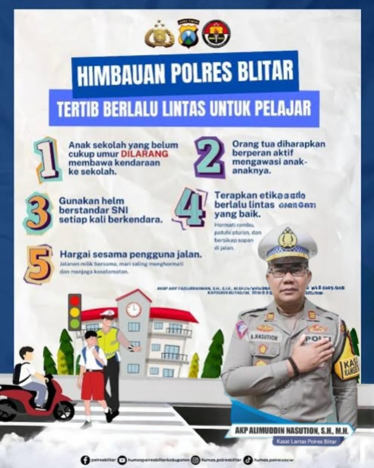 Blitar l bnewsnasional.id - Keselamatan di jalan raya adalah tanggung jawab kita bersama. Menyikapi hal ini, Kepala Satuan Lalu Lintas (Kasat Lantas) Polres Blitar, AKP Alimuddin Nasution, S.H., M.H., menyampaikan himbauan penting kepada seluruh pelajar di wilayah hukum Polres Blitar terkait ketertiban berlalu lintas. Himbauan ini bertujuan untuk menekan angka kecelakaan lalu lintas yang melibatkan pelajar dan menciptakan budaya berlalu lintas yang aman dan nyaman.