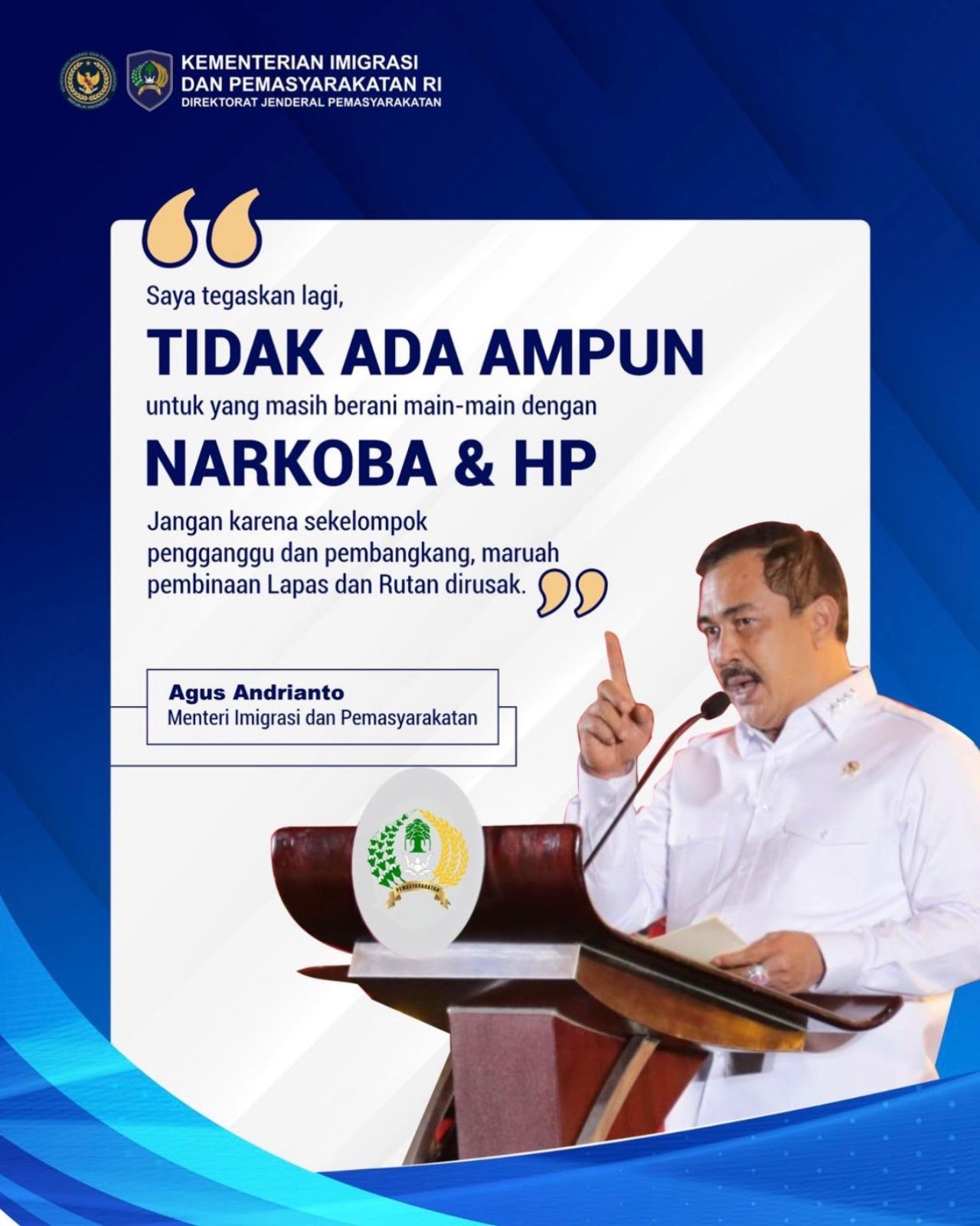 "Saya tegaskan lagi, tidak ada ampun untuk yang masih berani main-main dengan narkoba & HP. Jangan karena sekelompok pengganggu dan pembangkang, maruah pembinaan Lapas dan Rutan dirusak," ujar Agus Andrianto dalam pernyataan yang diabadikan dalam sebuah poster resmi Direktorat Jenderal Pemasyarakatan.