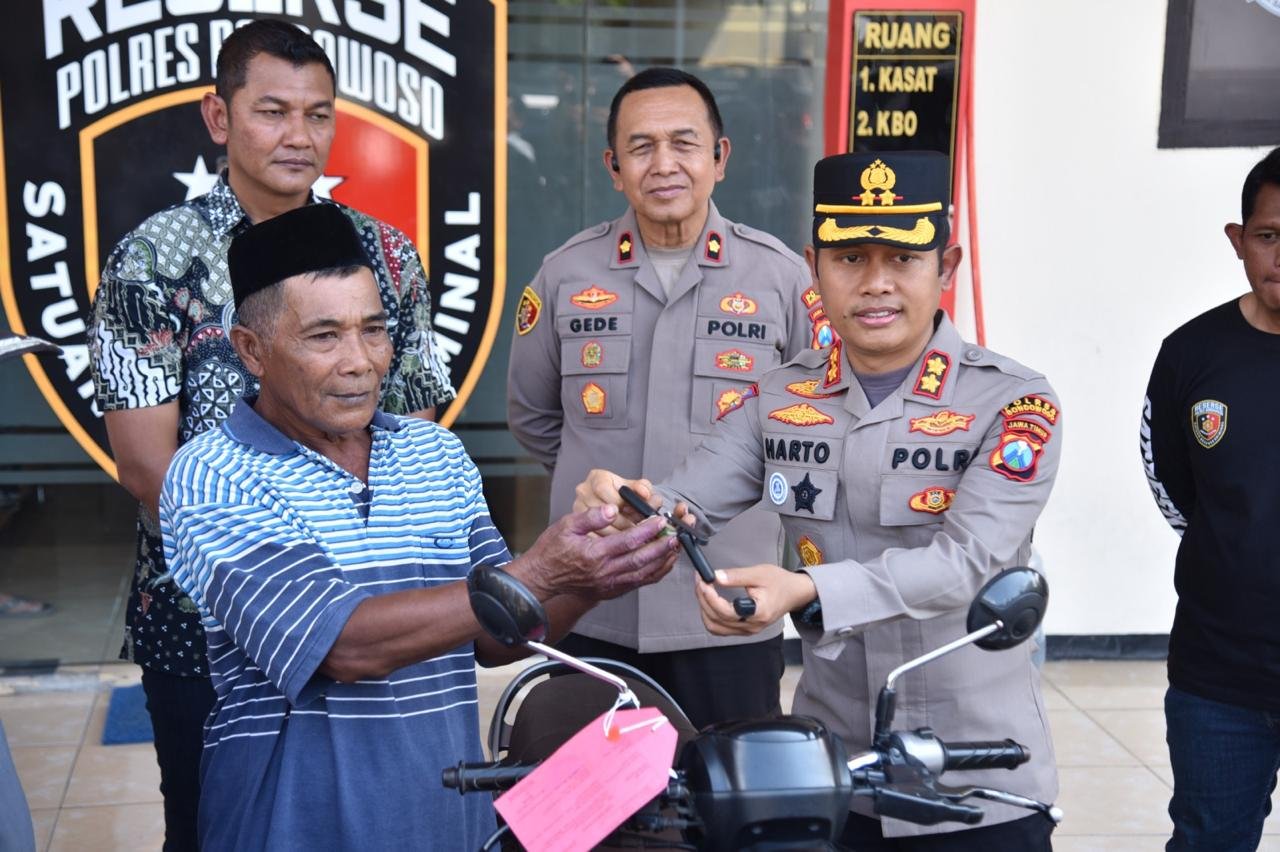 Polisi berhasil mengamankan tersangka berikut motor hasil curian dan sudah diserahkan kembali kepada pemiliknya yaitu Lasmar (60) warga Kecamatan Taman Krocok, Kabupaten Bondowoso, Jawa Timur.