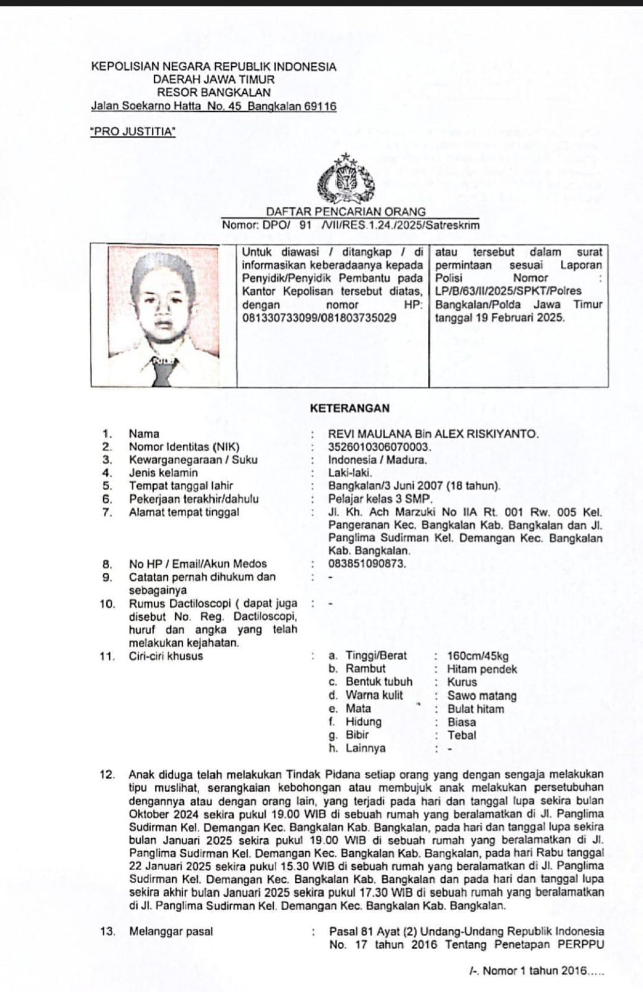 Bangkalan, bnewsnasional.id - Penanganan kasus dugaan pencabulan terhadap seorang siswi SMP di Bangkalan kembali memicu gelombang kritik dan kekecewaan publik. Di tengah lambannya penangkapan terlapor yang sudah berstatus Daftar Pencarian Orang (DPO), muncul dugaan adanya praktik pungutan liar (pungli) sebesar Rp3 juta yang disebut-sebut untuk “mempercepat” proses penangkapan pelaku.