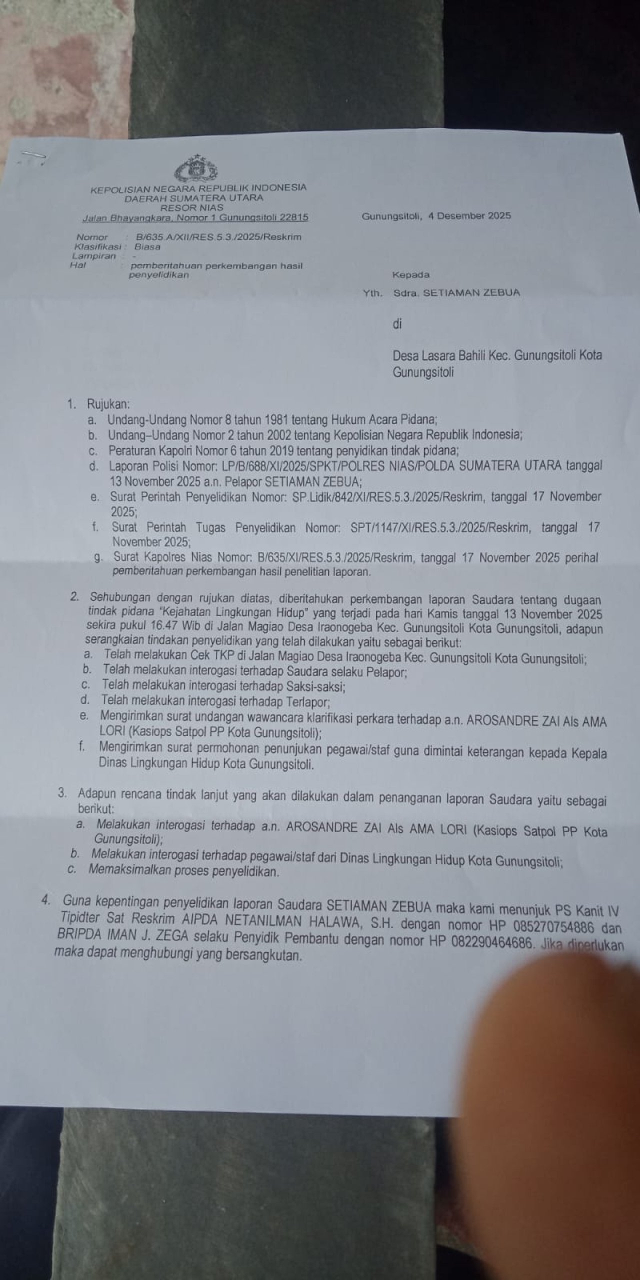Polres Nias, merespons laporan tersebut dengan menerbitkan Surat Perintah Penyelidikan (Sprinlidik) dan Surat Perintah Tugas Penyelidikan (Sprin Gas Lidik) pada 17 November 2025.
