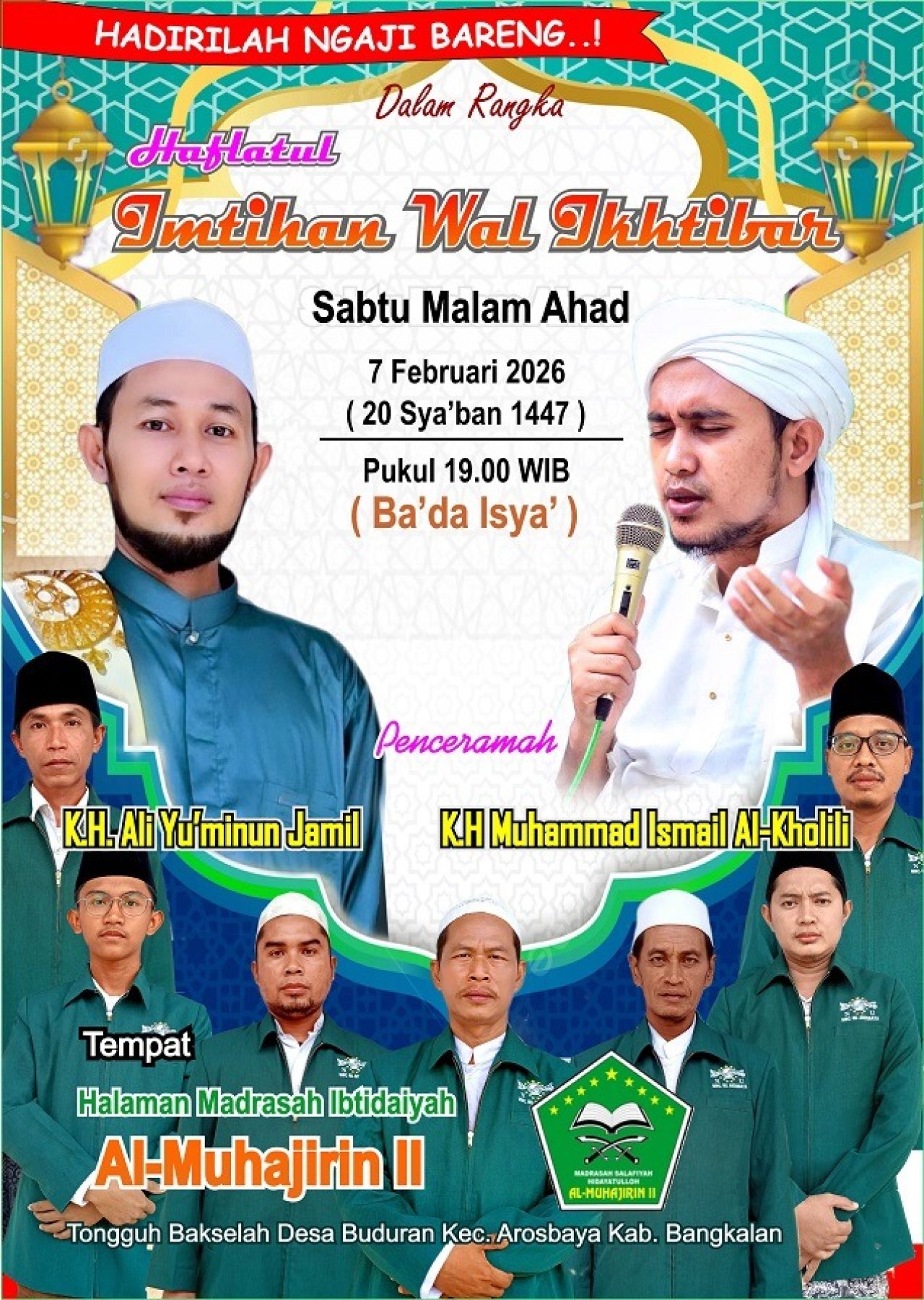 Bangkalan, bnewsnasional.id – Madrasah Ibtidaiyah (MI) Al-Muhajirin II yang berlokasi di Dusun Tongguh, Desa Buduran, Kecamatan Arosbaya, Kabupaten Bangkalan, akan menggelar kegiatan Haflatul Imtihan wal Ikhtibar ke-35 pada Sabtu malam Ahad, 7 Februari 2026 atau bertepatan dengan 20 Sya’ban 1447 Hijriah.