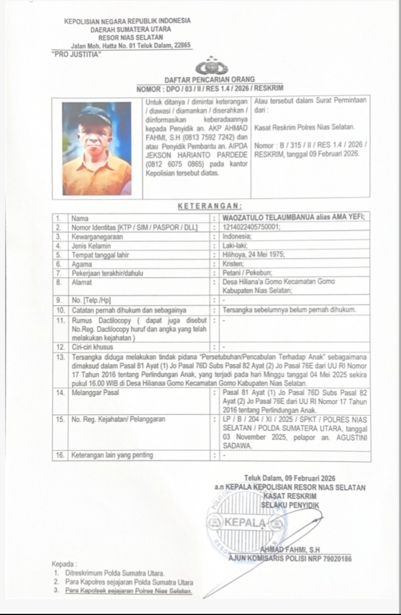 KEPOLISIAN NEGARA REPUBLIK INDONESIA DAERAH SUMATERA UTARA RESOR NIAS SELATAN Jalan Moh. Hatta No. 01 Teluk Dalam, 22665 "PRO JUSTITIA"l DAFTAR PENCARIAN ORANG NOMOR: DPO/03/II/RES 1.4/2026/RESKRIM Atau tersebut dalam Surat Permintaan dari Untuk ditanya/dimintai keterangan /diawasi/diamankan/diserahkan diinformasikan keberadaannya kepada Penyidik an. AKP AHMAD FAHMI, S.H (0813 7592 7242) dan atau Penyidik Pembantu an. AIPDA JEKSON HARIANTO PARDEDE (0812 6075 0865) pada kantor Kepolisian tersebut diatas.