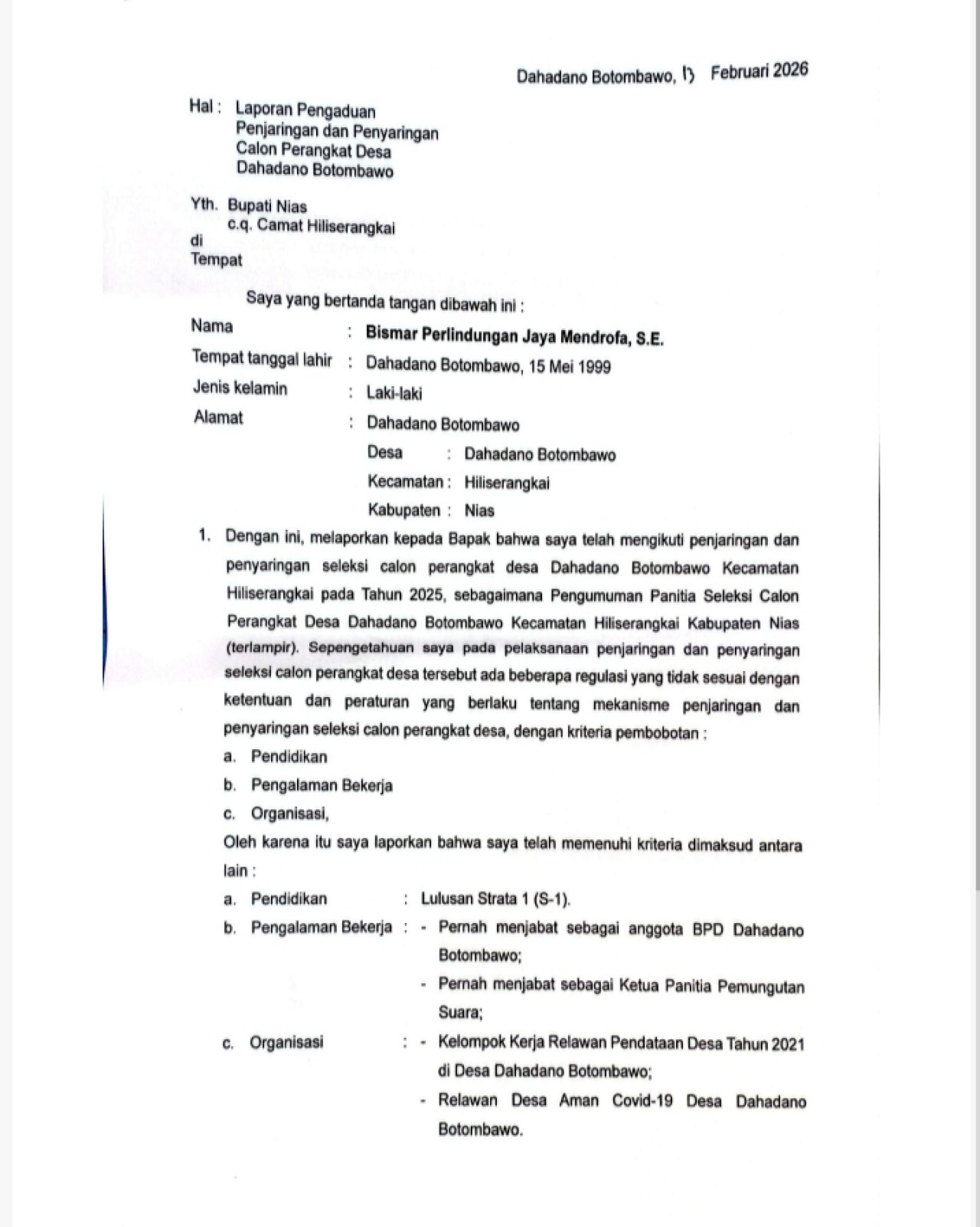 Nias, Indonesia - Proses seleksi calon perangkat desa Dahadano Botombawo di Kabupaten Nias diguncang oleh dugaan kecurangan. Bismar Perlindungan Jaya Mendrofa, S.E., seorang peserta seleksi, melaporkan bahwa panitia seleksi tidak konsisten dalam menerapkan kriteria pembobotan nilai, sehingga mengabaikan hak-hak peserta yang memenuhi syarat.