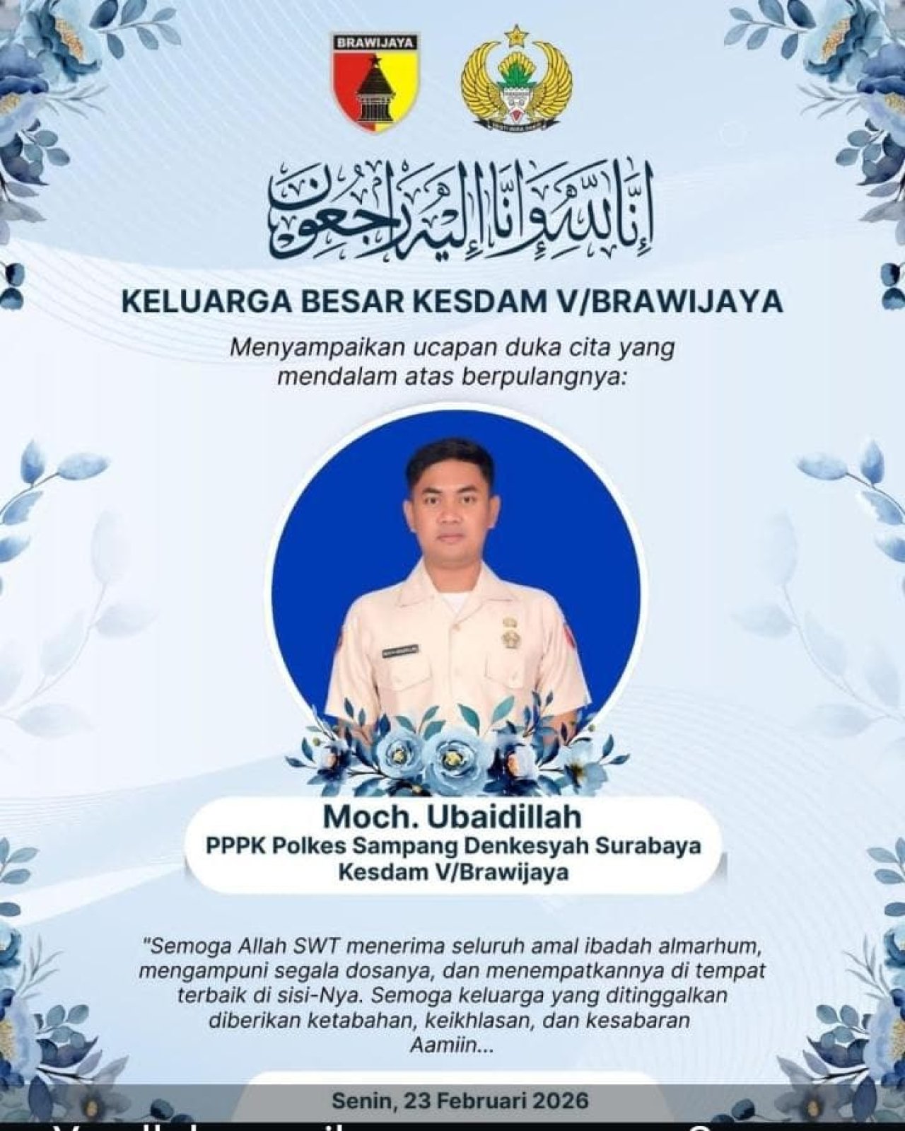 Sampang, BnewsNasional.id - Kabar duka menyelimuti Keluarga PPPK Polkes Kodim Sampang Kesdam V / Brawijaya Surabaya atas meninggalnya Ubaidillah selaku anggota bagian kesehatan akibat kecelakaan maut yang merenggut nyawanya pada hari Senin (23/2/2026).