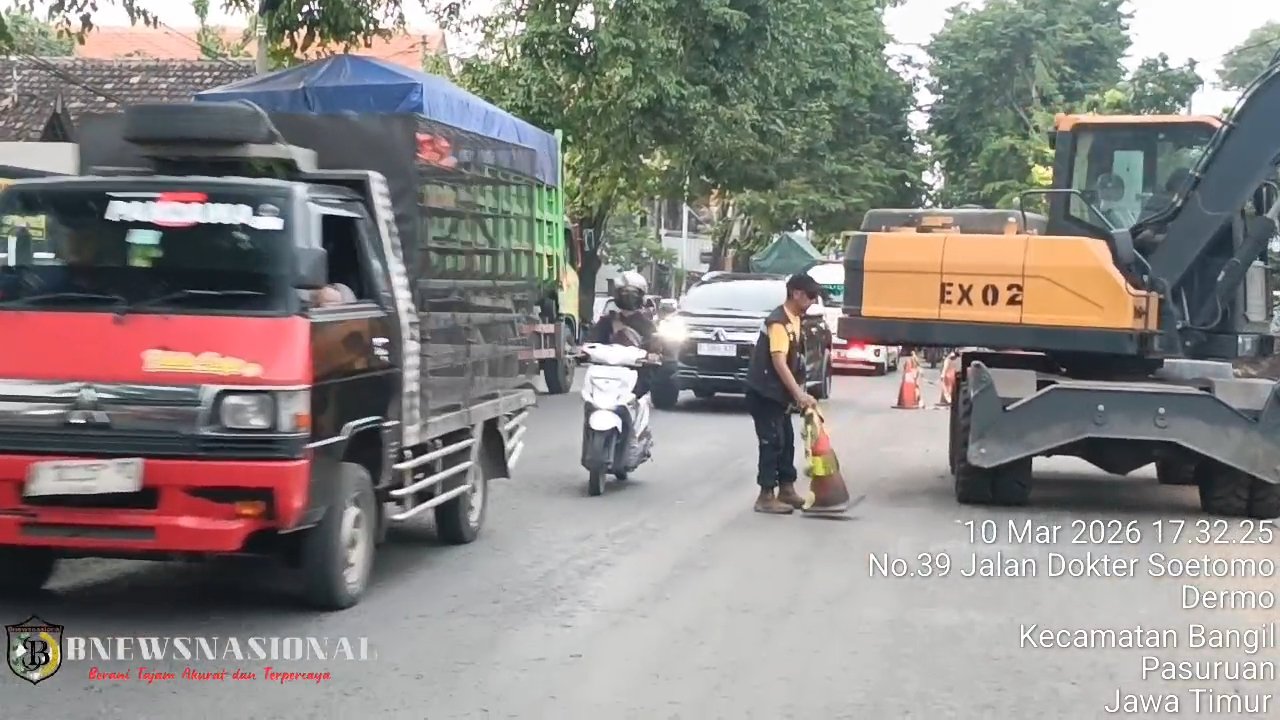 Bangil, BnewsNasional.id – Kemacetan panjang mewarnai pengerjaan proyek drainase di jalur utama yang menghubungkan kawasan industri dan pemukiman. Dari pantauan di lokasi, volume kendaraan yang tinggi, termasuk truk-truk besar bermuatan berat, terpaksa merayap di sisi galian yang tidak dibatasi dengan barikade pengaman standar, Selasa (10/03/2026).