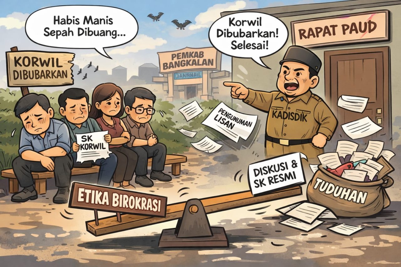Bangkalan, bnewsnasional.id – Kebijakan pembubaran Koordinator Wilayah (Korwil) Pendidikan di tingkat kecamatan menuai keluhan dari sebagian pihak yang sebelumnya menjabat sebagai korwil. Mereka menilai langkah yang diambil Kepala Dinas Pendidikan (Kadisdik) Bangkalan, Musleh, kurang mengedepankan etika birokrasi.