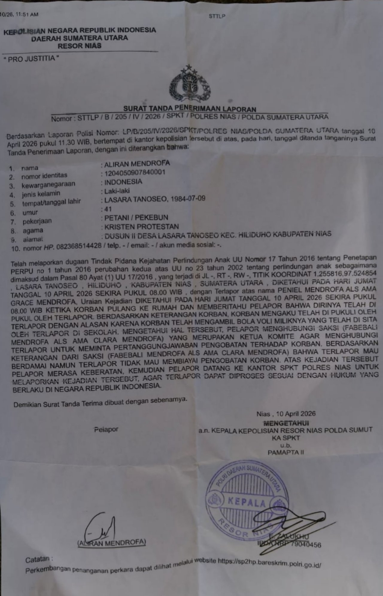 Nias Indonesia .bnewsNasional.id - Tercoret kembali dunia pendidikan Seorang warga melaporkan dugaan tindak pidana kekerasan terhadap anak ke Polres Nias. Laporan tersebut telah diterima dan tercatat dalam Surat Tanda Penerimaan Laporan (STTPL) pada Jumat, 10 April 2026.