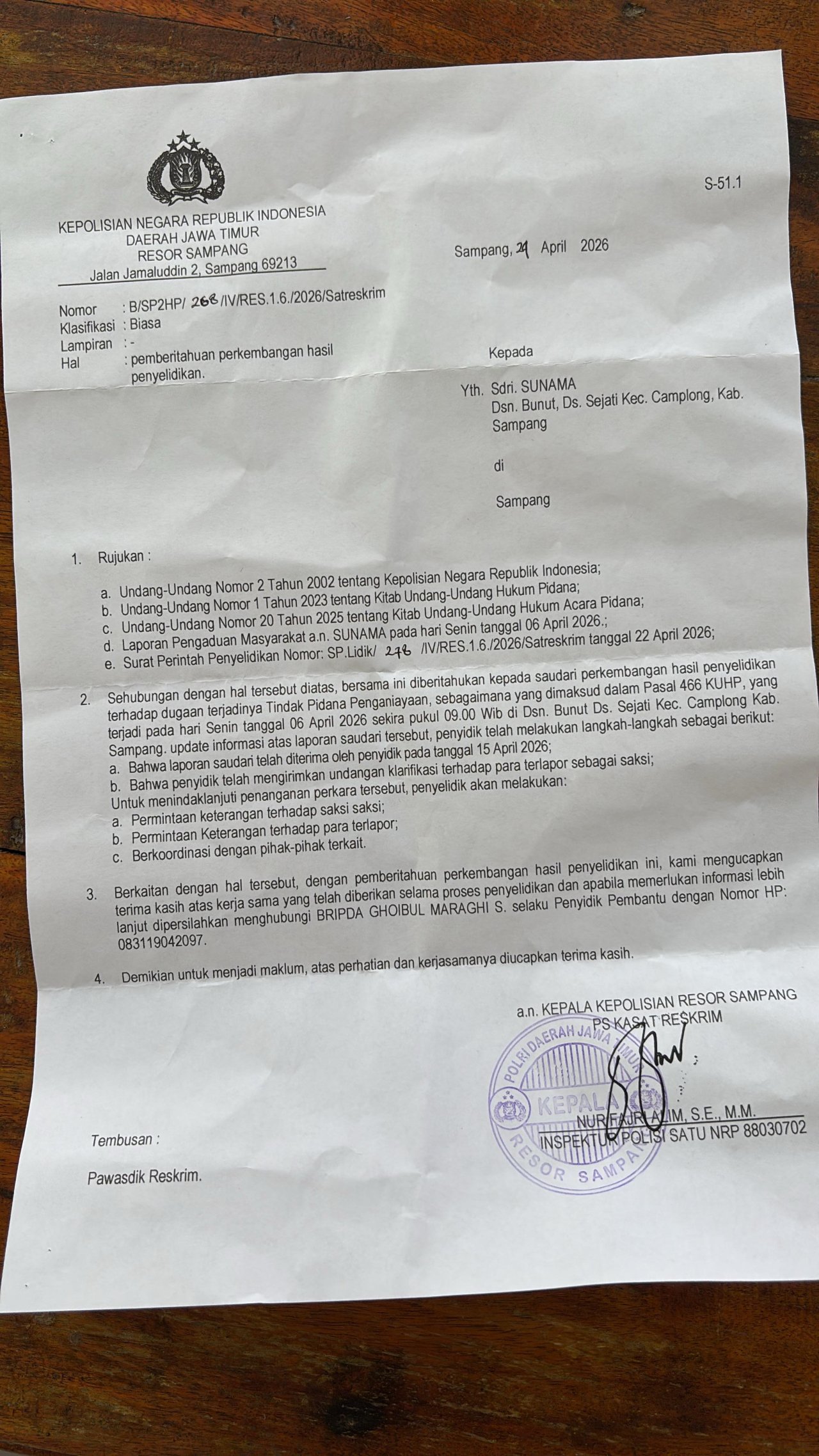 Berdasarkan informasi yang dihimpun, sedikitnya terdapat tiga laporan polisi (LP) yang telah dilayangkan, mencakup dugaan penganiayaan, pengancaman, penyerobotan lahan, pengrusakan, hingga tekanan untuk mencabut laporan. Seluruh laporan tersebut saat ini berada dalam penanganan Polres Sampang di wilayah Kabupaten Sampang.