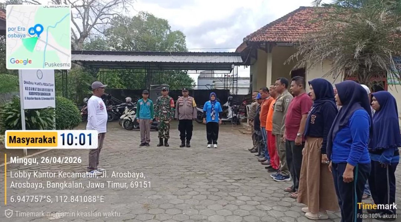 Bangkalan,bnewsnasional.id – Pemerintah Kecamatan Arosbaya, Kabupaten Bangkalan, menggelar kegiatan simulasi kesiapsiagaan bencana dalam rangka memperingati Hari Kesiapsiagaan Bencana (HKB) Tahun 2026 yang dipusatkan di Kantor Kecamatan Arosbaya, Minggu pagi. Kegiatan tersebut diikuti unsur Forkopimcam, perangkat desa, sekolah, dan masyarakat sekitar.