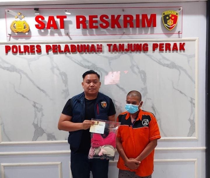 Dari kasus tersebut, pihak kepolisian Satreskrim Polres Pelabuhan Tanjung Perak telah menyita sejumlah barang bukti seperti satu kaos lengan pendek warna hitam, satu celana warna pink, satu celana dalam warna pink dan satu buah BH warna kuning.