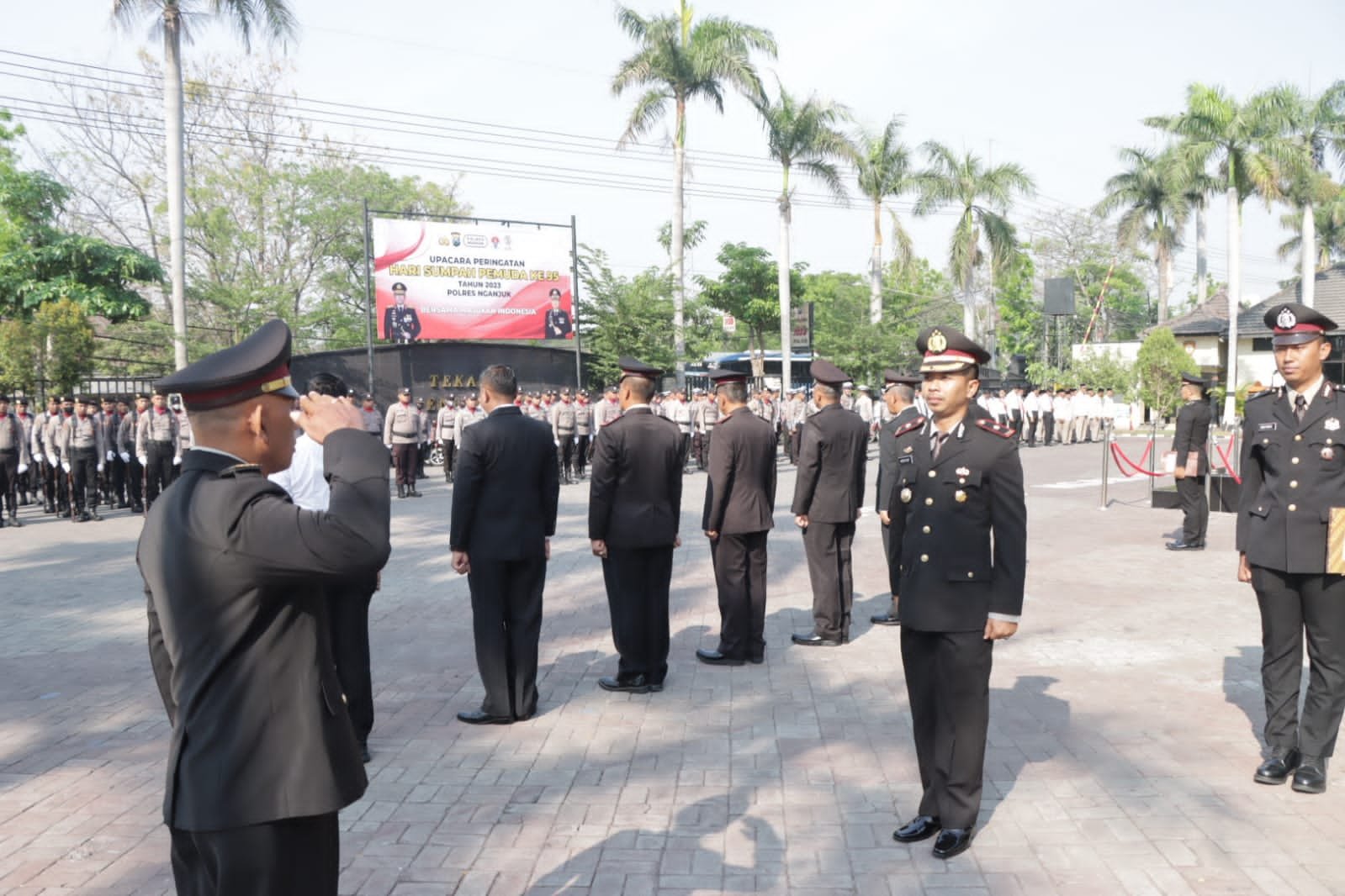 Nganjuk - (Berita News Nasional) Kapolres Nganjuk AKBP Muhammad, S.H., S.I.K., M.Si., diwakili Wakapolres Nganjuk Kompol Mustijat Priyambodo, S.I.K., M.H., memimpin upacara bendera dalam rangka memperingati Hari Sumpah Pemuda ke – 95 tahun 2023, Sabtu (28/10/2023).