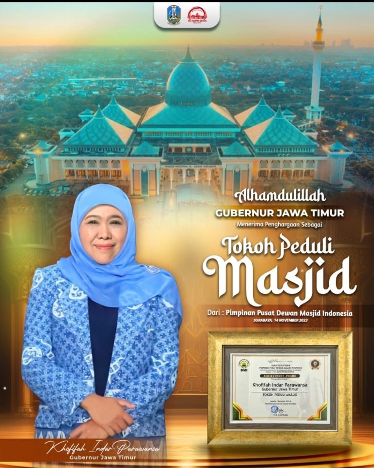 Surabaya - (Berita News Nasional) – Gubernur Jawa Timur Khofifah Indar Parawansa menerima penghargaan sebagai Tokoh Peduli Masjid dari Pengurus Pusat Dewan Masjid Indonesia (PP DMI). Penghargaan tersebut berdasarkan SK PP DMI No. 192.A/I/SK/PP.DMI/XI/2023. (17/11/23)