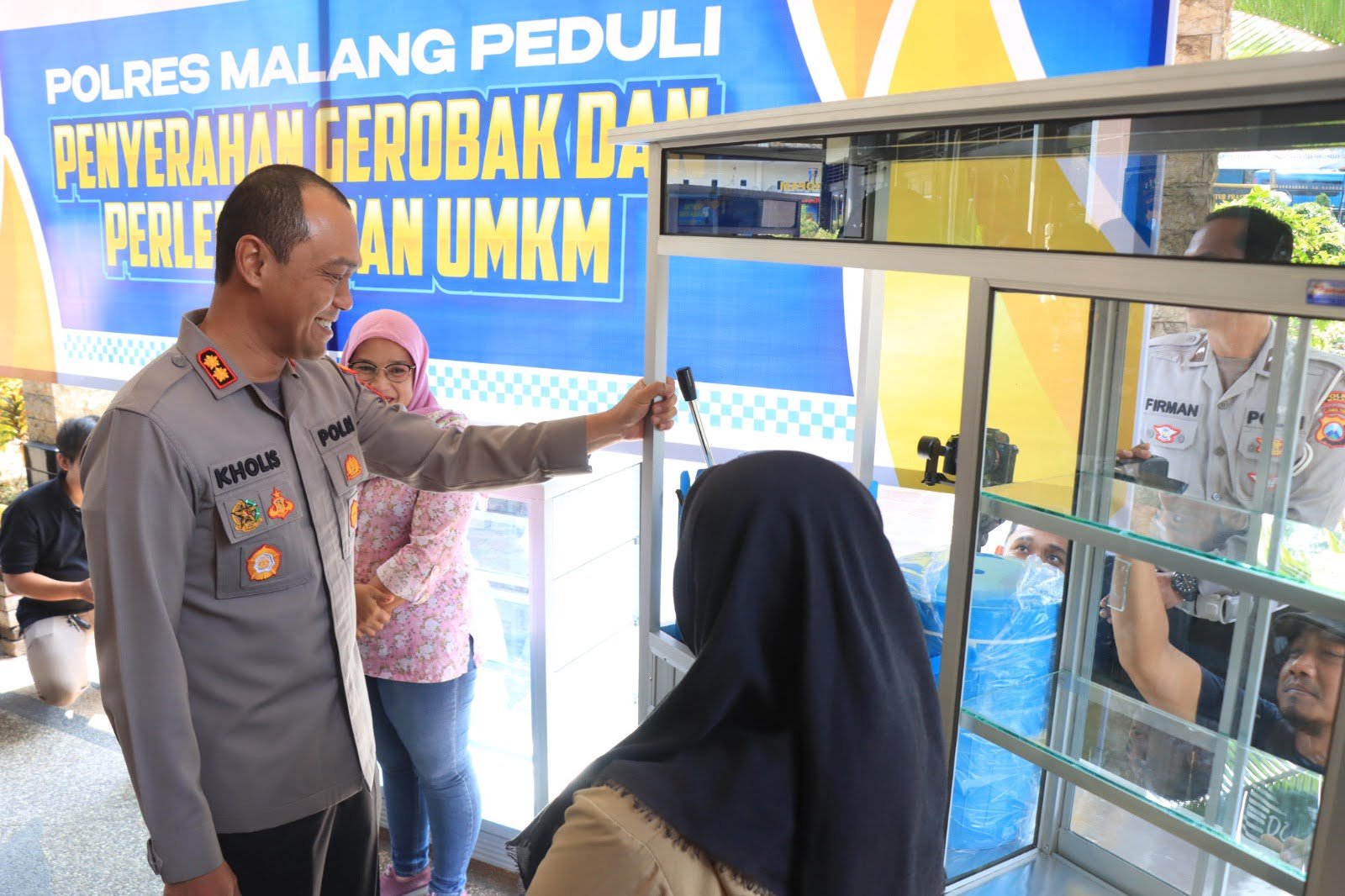 Kapolres Malang, AKBP Putu Kholis Aryana, secara langsung menyerahkan bantuan permodalan dan sarana pengembangan Usaha Mikro, Kecil, dan Menengah (UMKM) kepada tiga keluarga yang menjadi korban di Mapolres Malang, Rabu (29/11/2023).