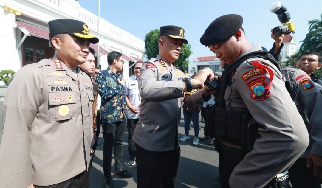 SURABAYA |beritanewsnasional.com  - Dalam rangka kesiapan Operasi Lilin Semeru 2023 dan Pam Pilpres 2024, Polrestabes Surabaya menerima 50 Unit Body Cam yang diserahkan langsung oleh Kapolda Jawa Timur Irjen Pol Imam Sugianto, di Lapangan A Polrestabes Surabaya, Rabu (20/12/2023).