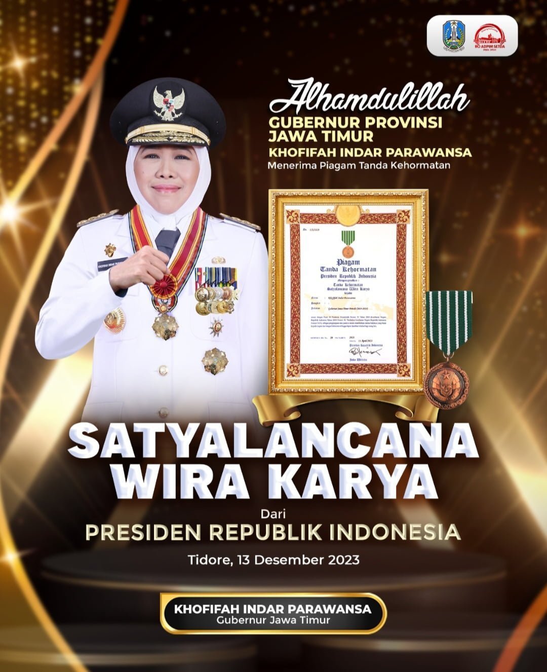 SURABAYA |nusantarajayanews.id – Gubernur Jawa Timur Khofifah Indar Parawansa menerima anugerah Tanda Kehormatan Satyalancana Wira Karya bidang pengelolaan pengembangan dan pembangunan kelautan dari Presiden RI Joko Widodo. Dan tertuang pada Keputusan Republik Indonesia No. 20/TK/Tahun 2023, Tentang Penganugerahan Tanda Kehormatan Satyalencana Wira Karya. (22/12/23)