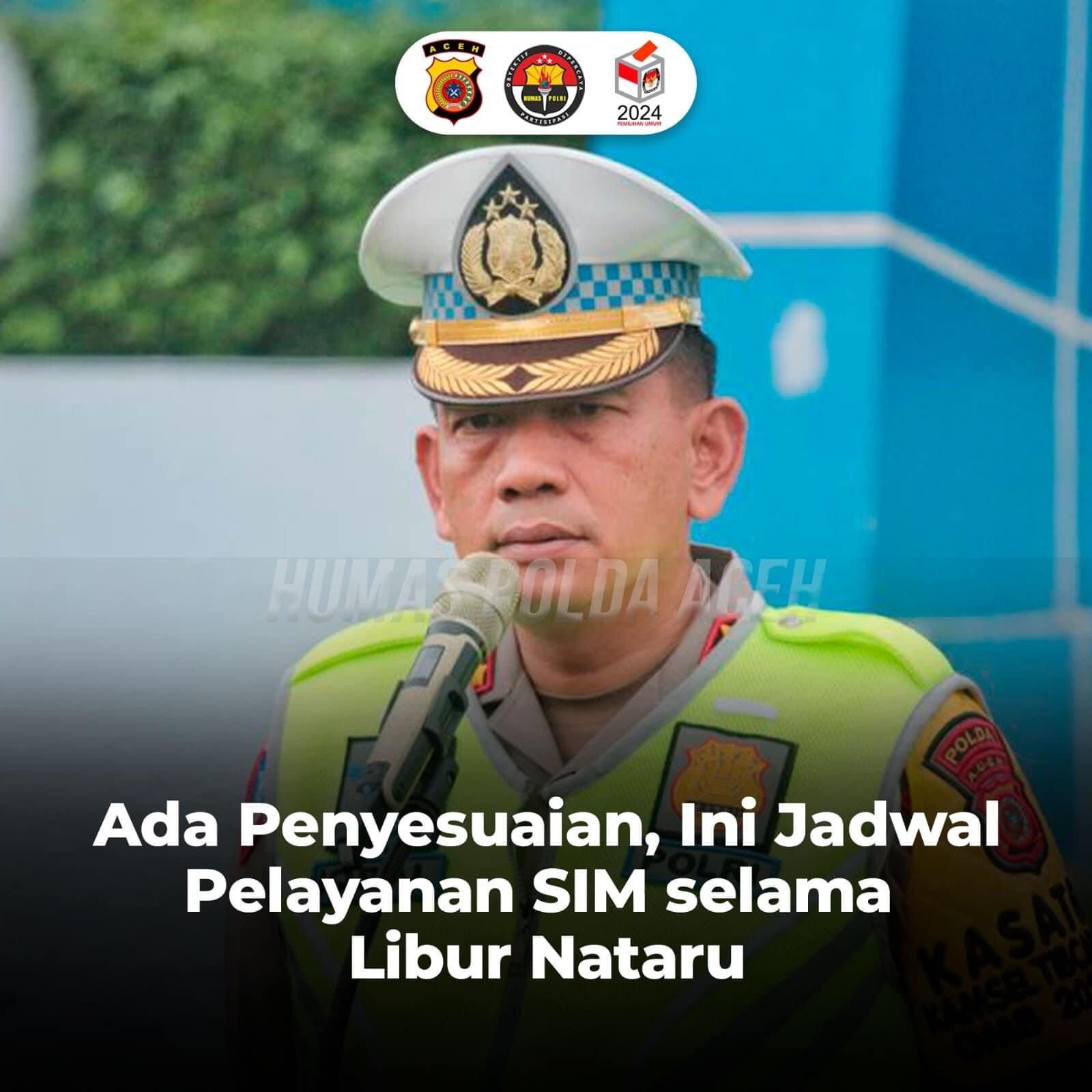 Aceh - (Beritanewsnasional.com) - Pelayanan perpanjangan dan penerbitan surat izin mengemudi (SIM) selama libur Natal dan Tahun Baru (Nataru) mengalami penyesuaian jadwal. Penyesuaian itu berdasarkan Surat Telegram Kapolri tentang Libur Natal 2023 dan Tahun Baru 2024 serta Pelaksanaan Pelayanan Penerbitan SIM.