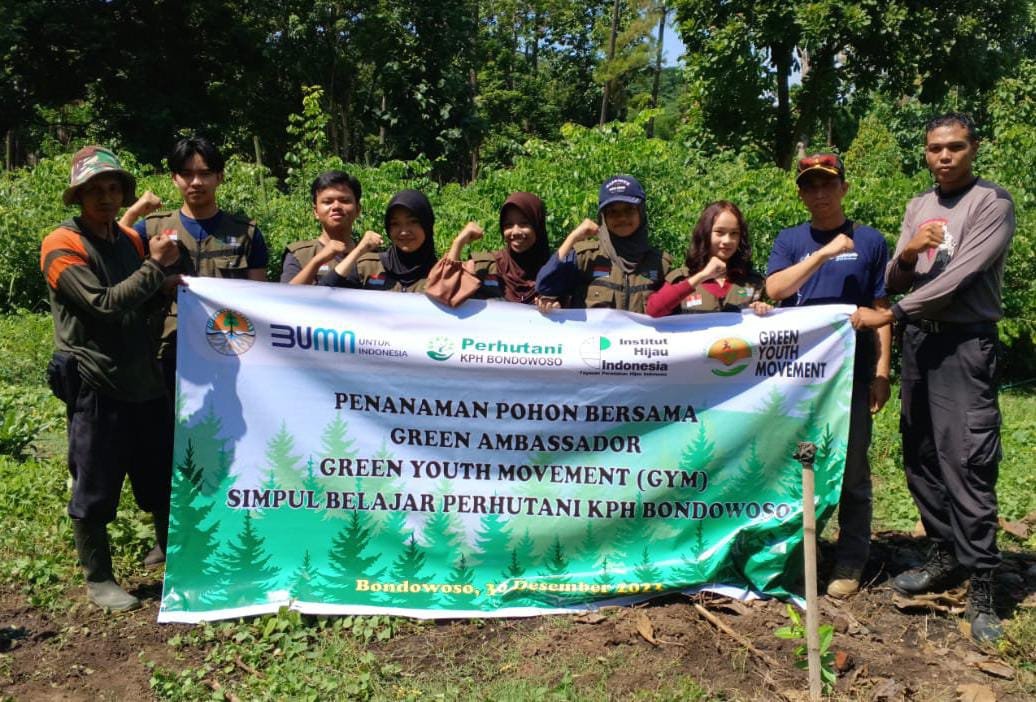 Tampak puluhan siswa siswi Green Ambassador sejak pagi terlihat hilir mudik membawa bibit dan cangkul serta melaksanakan penanaman pohon pada acara simpul belajar Perhutani Bondowoso yang berlokasi di petak 65C RPH Brebes BKPH Klabang.